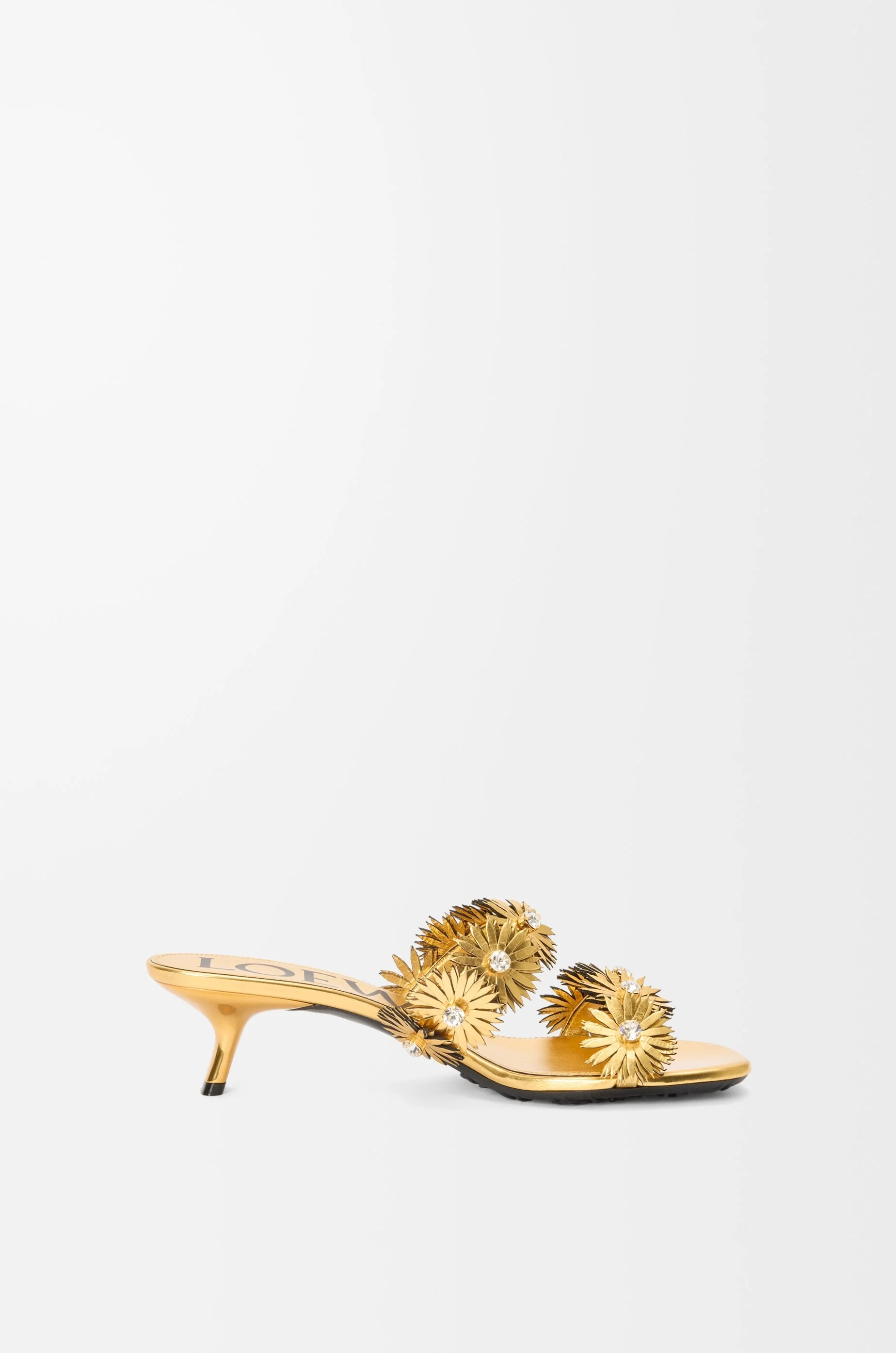 Sandal in metallic calfskin and crystals featuring a strappy upper with hand-applied floral embellishments and a signature petal toe shape. - 45mm heel - Anagram debossed rubber outsole Colour: Gold Main material: Metallic Calfskin/ Crystals Weight: 0.44 kg Made in: Italy