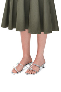 Stiletto sandal in metallic calfskin with allover rhinestones featuring the signature petal-shaped toe, a glossy lacquered angled heel and a debossed Anagram rubber sole. - 45mm heel - Leather insole Details - Colour : Silver - Main material : Metallic Calf - Heel height : 4.5 - Weight : 0.36 kg - Model ID : LPET465X04 - Made in : Italy