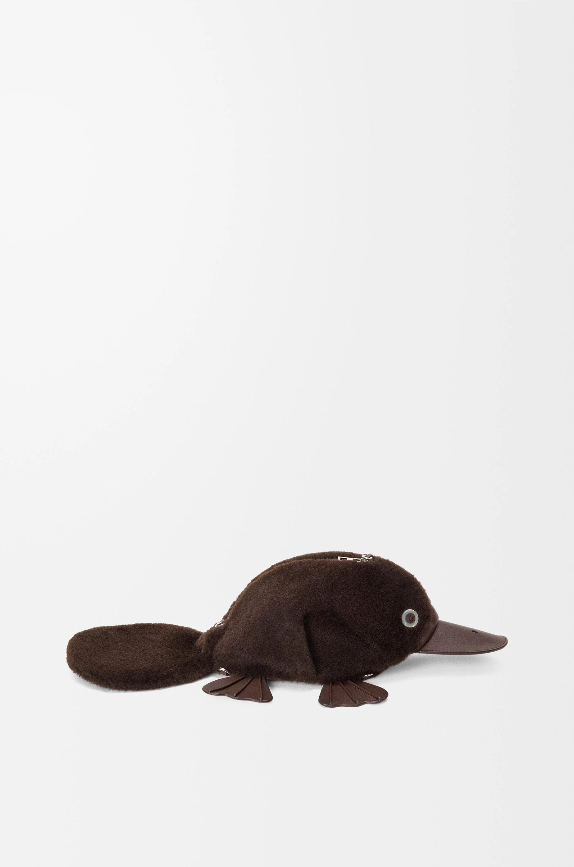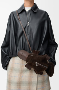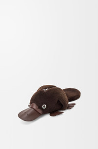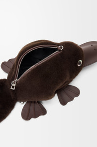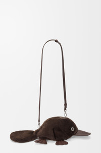 The Platypus bag is a whimsical variation on the signature animal bags. This version is crafted in shearling with smooth calfskin details. - Shoulder, crossbody or belt carry - Detachable and adjustable strap - Zip closure - Herringbone cotton canvas lining - Embossed LOEWE Colour: Chocolate Metallic colour: Palladium Main material: Shearling Strap length: 91 - 119 cm Strap drop: 41 - 55 cm Weight: 0.26 kg Height: 12 cm Width: 17.5 cm Depth: 11 cm Made in: Spain