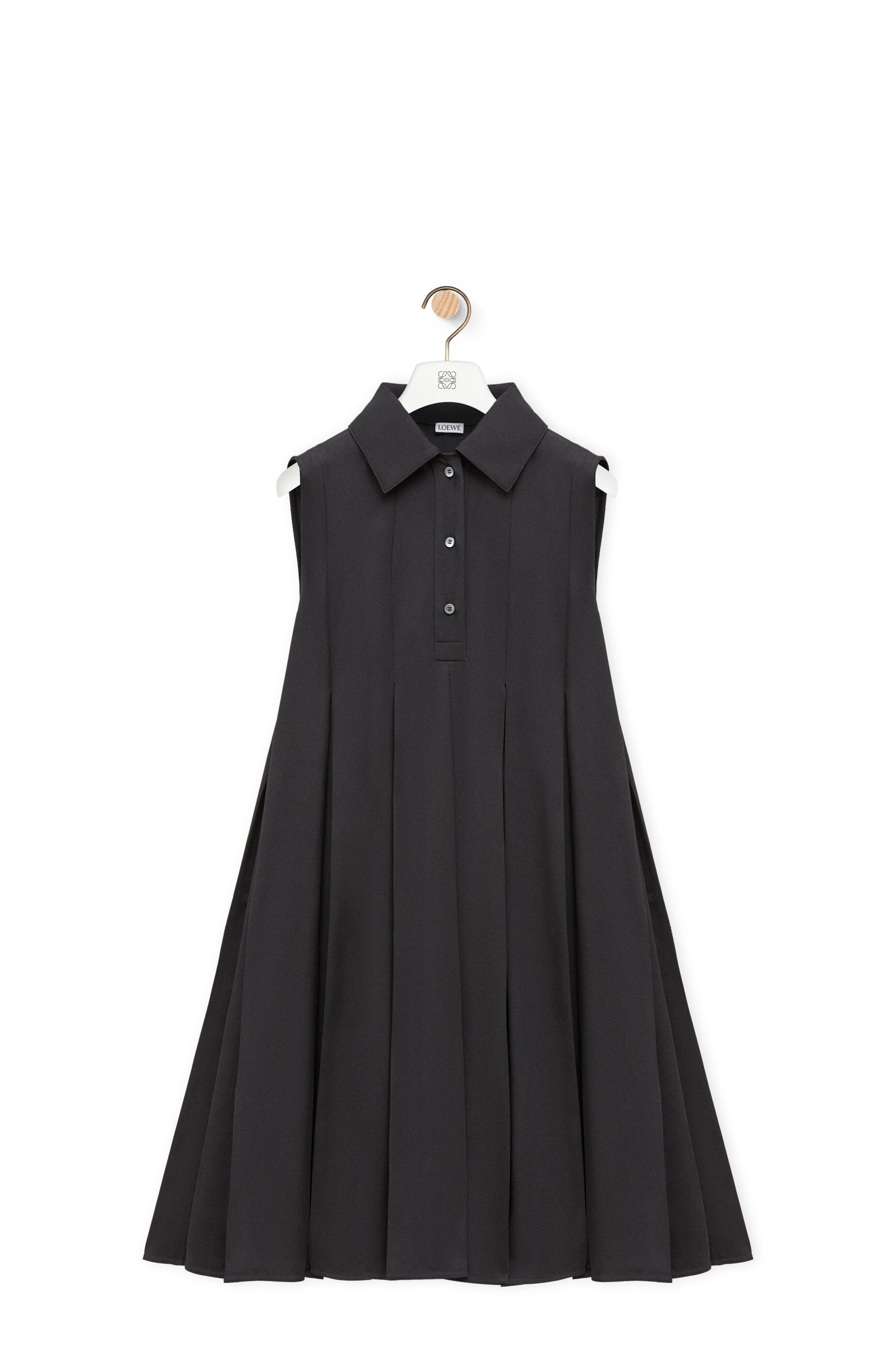 Dress in medium-weight stretch viscose cady featuring a trapeze silhouette with box pleats. - Regular fit, knee length - Polo collar - Partially lined - LOEWE Anagram embossed leather patch placed at the back Details - Colour : Black - Main material : Viscose/Elastan - Weight : 0.6 kg - Model ID : S359Y09XG5 - Made in : Spain