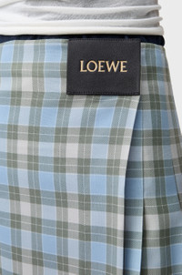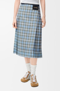 Skirt in lightweight wool blend tartan featuring a wrap construction with pleats at the sides and back. - Regular fit, knee length - Mid waist - Concealed snap button fastening - LOEWE embossed leather patch placed at the front Colour: Light Blue/White Main material: Polyester/Wool Weight: 0.4 kg Made in: Spain Materials & care Main Material: 55% polyester 45% wool