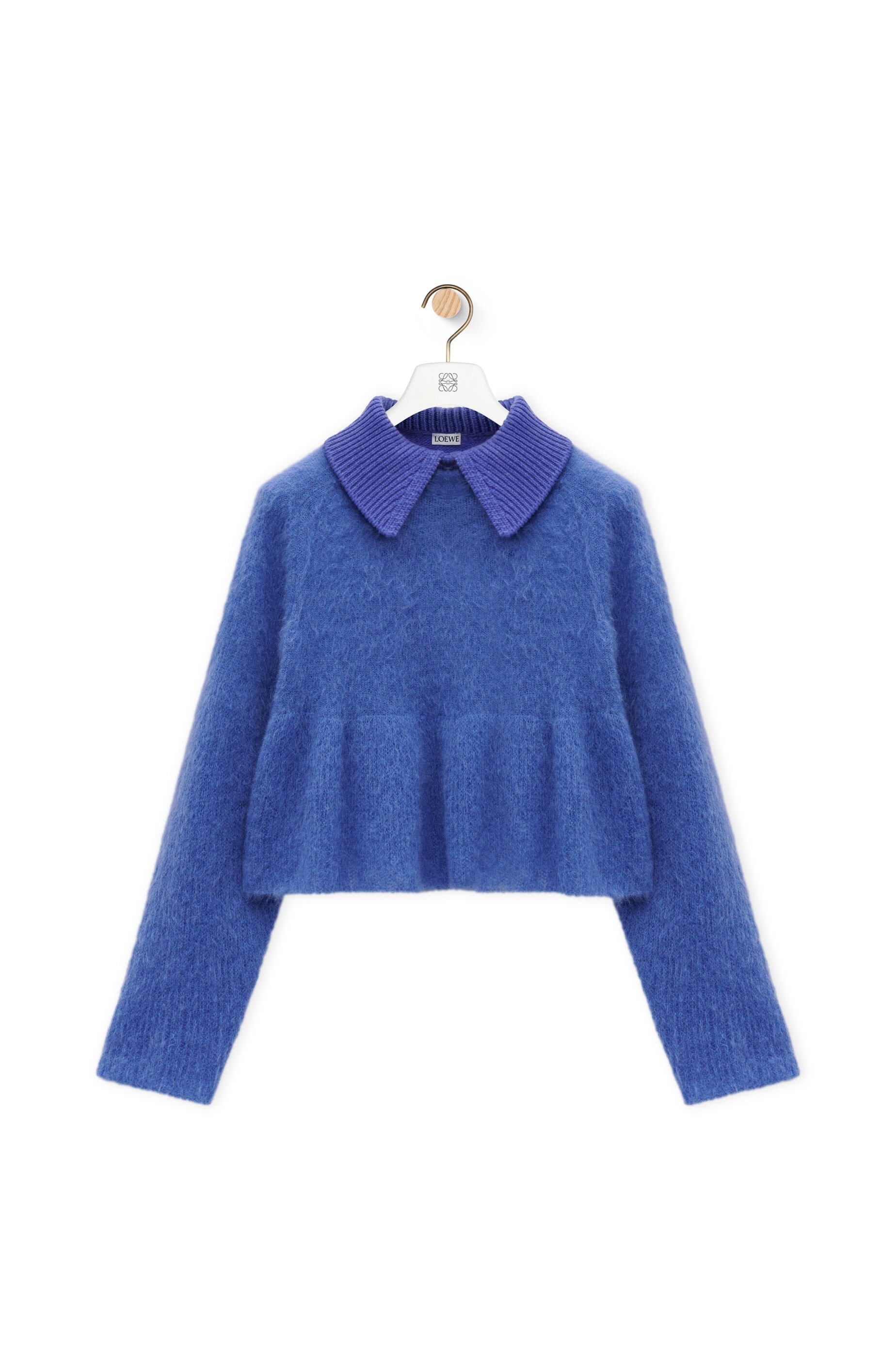 Sweater crafted in medium-weight mohair. - Washed and brushed jersey stitch - Regular fit - Short length - Trapeze silhouette - Trompe l’oeil rib knit collar - LOEWE charm placed at the back Details - Colour : Blue - Main material : Wool/Mohair - Weight : 0.15 kg - Model ID : S540Y14KFD - Made in : Italy