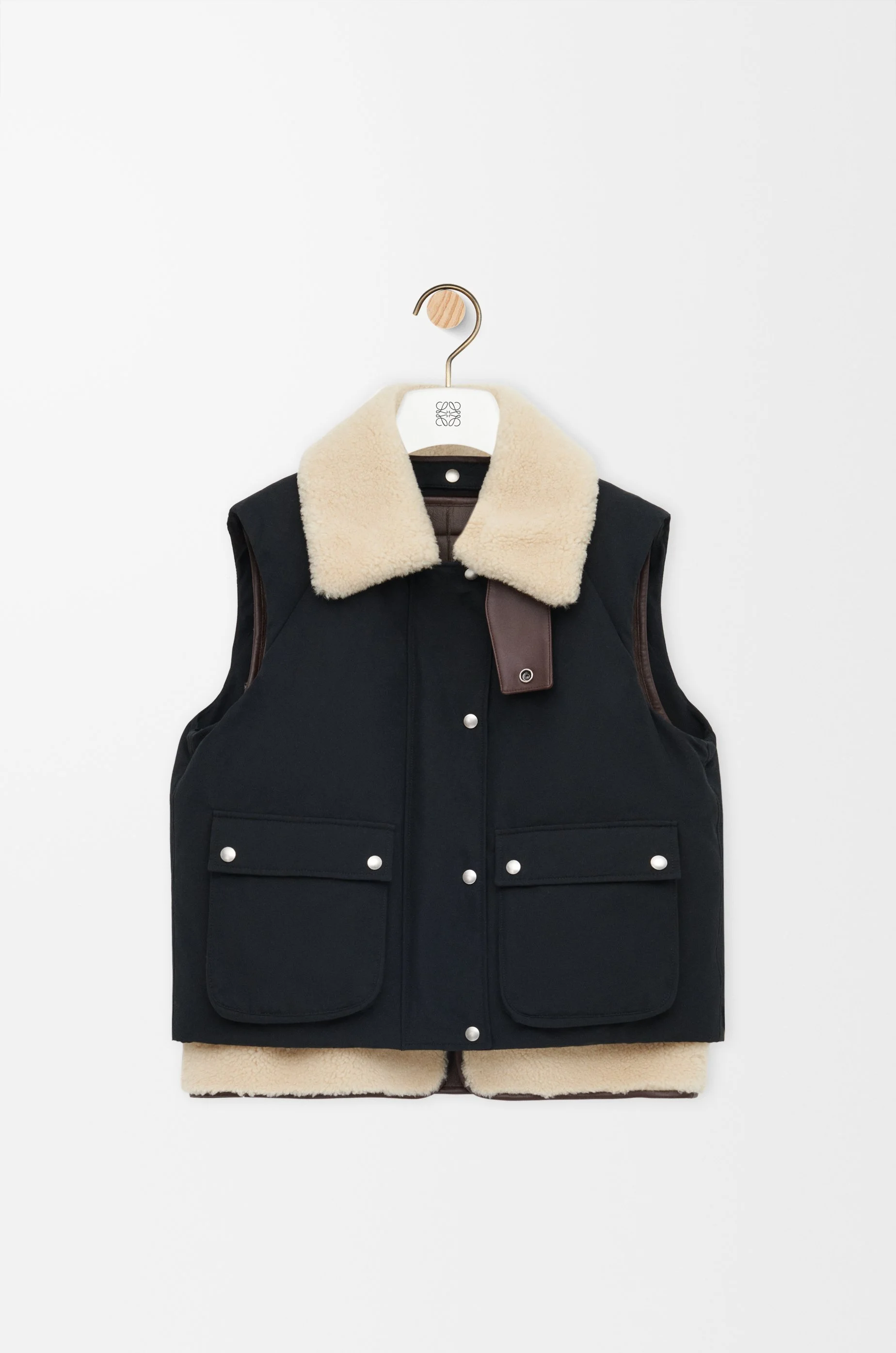 Puffer vest in lightweight technical cotton blend featuring a detachable shearling vest and collar. - Regular fit, short length - Leather chin strap - Snap button and concealed zip front fastening - Buttoned gusset flap pockets - LOEWE Anagram embossed leather patch placed at the back Colour: Black Main material: Cotton/Polyamide Weight: 1.2 kg Made in: Italy