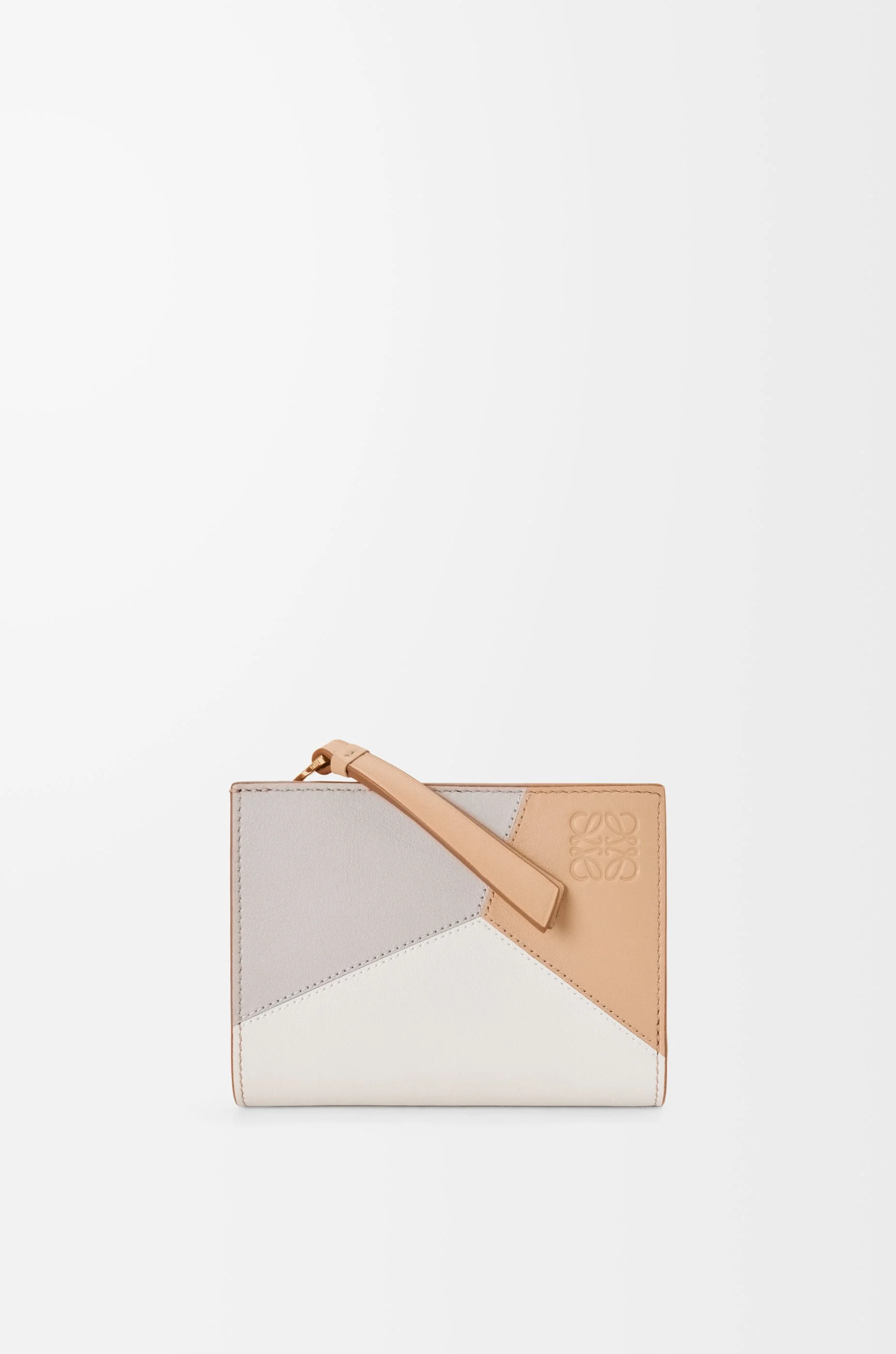 Compact wallet inspired by the Puzzle bag's distinctive geometric pattern. This version is crafted in classic calfskin in contrasting colours. - Six card slots, three slip pockets - One zipped coin compartment - Snap button closure - Embossed Anagram Colour: Ghost/Silky Beige Metallic colour: Gold Main material: Classic Calf Weight: 0.099 kg Height: 8.5 cm Width: 11.4 cm Depth: 3 cm Made in: Spain