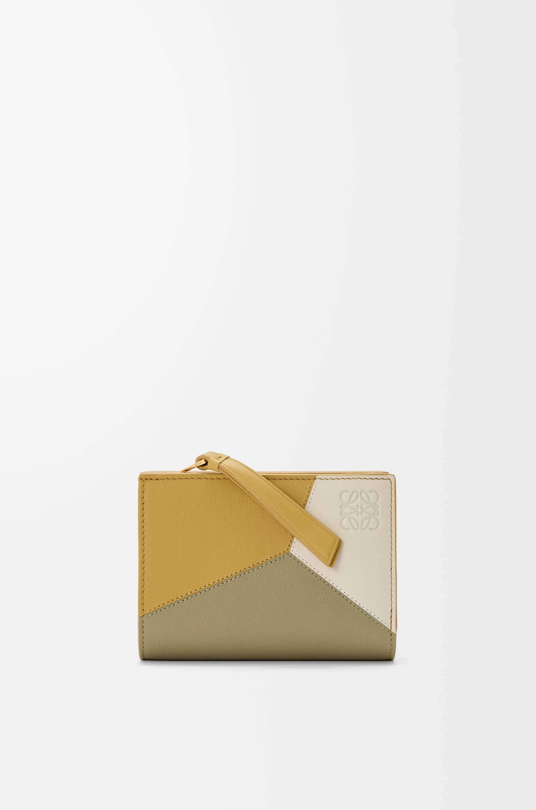 Compact wallet inspired by the Puzzle bag's distinctive geometric pattern. This version is crafted in classic calfskin in contrasting colours. - Six card slots, three slip pockets - One zipped coin compartment - Snap button closure - Embossed Anagram Colour: Ginger/Sea Salt Metallic colour: Gold Main material: Classic Calf Weight: 0.099 kg Height: 8.5 cm Width: 11.4 cm Depth: 3 cm Made in: Spain
