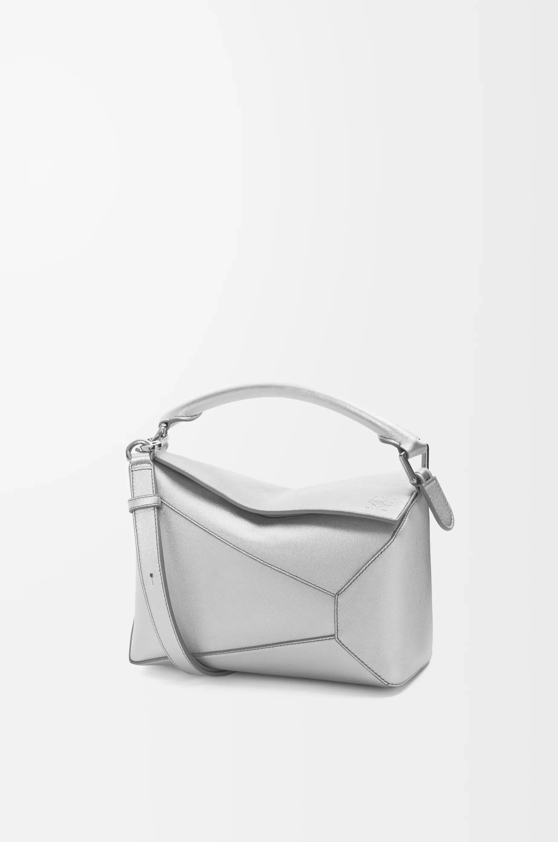 The Puzzle bag is the debut bag for LOEWE by Creative Director Jonathan Anderson. A cuboid shape and precise cutting technique create Puzzle’s distinctive geometric lines. This small version is crafted in laminated lambskin. - Shoulder, crossbody or hand carry - Detachable and adjustable strap, top handle - Zip closure with calfskin pull - One external zip rear pocket, one internal slip pocket - Suede lining - Embossed Anagram Details - Colour : Silver - Metallic colour : Palladium - Main material : Laminated Lambskin - Strap length : 80.5 - 115.5 cm - Strap Drop : 40 - 58 cm - Handle drop : 7 cm - Weight : 0.52 kg - Height (cm) : 16.5 - Width (cm) : 24 - Depth (cm) : 10.5 - Height (inch) : 6.5 - Width (inch) : 9.4 - Depth (inch) : 4.1 - Model ID : A510P60X96 - CIL : - 0011243193 - Made in : Spain