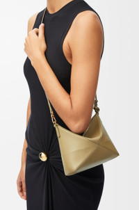 Revisited as a functional and versatile pouch, the Puzzle Fold takes the iconic bag’s signature geometric lines and reimagines them in graphic and architectural panels. This version is crafted in shiny nappa calfskin. - Can be carried on the shoulder, crossbody or inside a bag - Detachable and adjustable strap - Zip closure - Suede lining - Gold embossed LOEWE Details - Colour: Clay Green - Metallic colour: Gold - Main material: Shiny Nappa Calf - Strap length: 52- 95 cm - Weight: 0.17 kg - Height (cm): 15.5 - Width (cm): 23 - Depth (cm): 6.5 - Height (inch): 6.1 - Width (inch): 9.1 - Depth (inch): 2.6 - Model ID: C510PT1X01 - CIL: 0010973824 - Made in: Spain