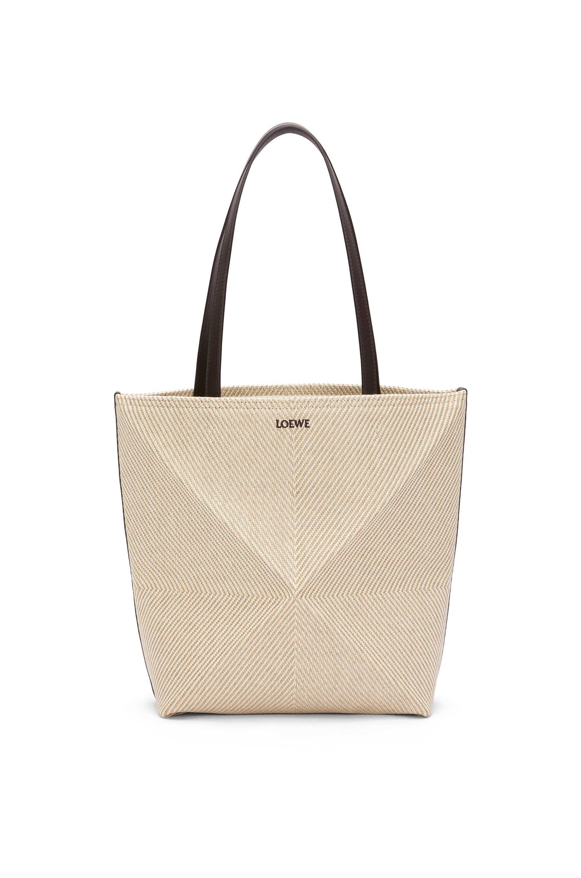 The Puzzle Fold Tote takes the iconic bag’s signature geometric lines and reimagines them in graphic and architectural panels that allow the bag to fold completely flat, making it the perfect travel companion. Soft, lightweight and inventively crafted, it is finished with discreet LOEWE branding. This version is crafted in cotton jacquard. - Shoulder or hand carry - bonded leather lining - Embroidered LOEWE Details - Colour: Ecru/Natural - Main material: Canvas - Handle drop: 27 cm - Weight: 0.4 kg - Height (cm): 31.5 - Width (cm): 25.5 - Depth (cm): 14.5 - Height (inch): 12.4 - Width (inch): 10 - Depth (inch): 5.7 - Model ID: A779G50X34 - CIL: 0010976991 - Made in: Spain