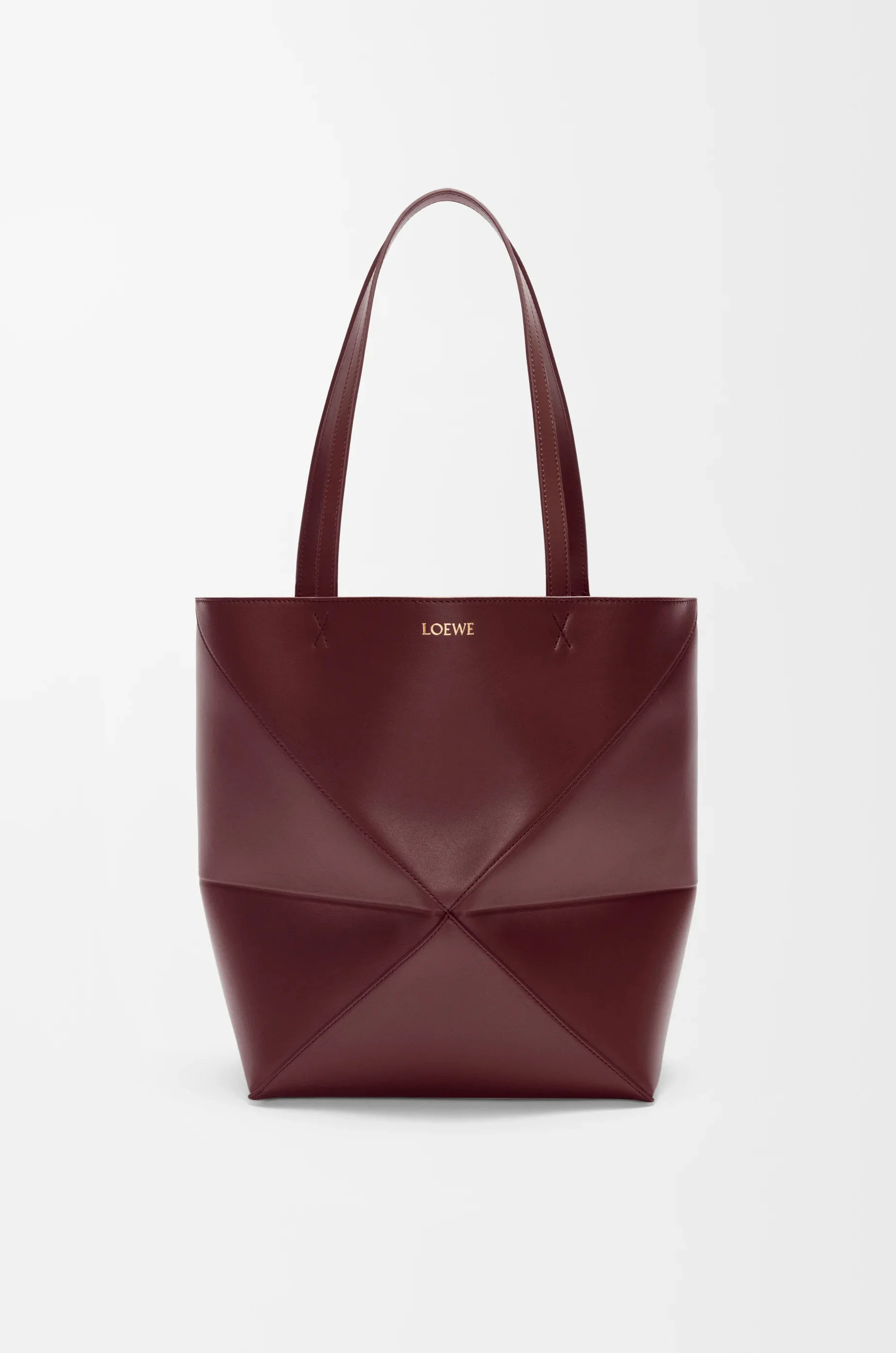 The Puzzle Fold Tote takes the iconic bag’s signature geometric lines and reimagines them in graphic and architectural panels that allow the bag to fold completely flat, making it the perfect travel companion. Soft, lightweight and inventively crafted, it is finished with discreet LOEWE branding. This medium version is crafted in shiny calfskin. - Shoulder or hand carry - Suede lining - Gold embossed LOEWE Details - Colour: Dark Burgundy - Main material: Shiny Calf - Handle drop: 27 cm - Weight: 0.43 kg - Height (cm): 31.5 - Width (cm): 25.5 - Depth (cm): 14.5 - Height (inch): 12.4 - Width (inch): 10 - Depth (inch): 5.7 - Model ID: A657G50X01 - CIL: 0011036373 - Made in: Spain