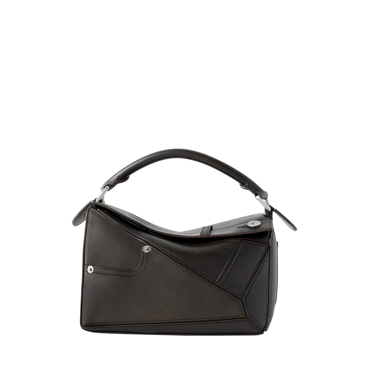 LOEWE Panta Small Puzzle Bag featuring distinctive geometric lines and cuboid form. This small version is crafted in shiny calfskin with denim trousers-inspired details, shoulder, crossbody or hand carry, detachable and adjustable strap, zip closure with calfskin pull, one external rear pocket, one internal slip pocket, herringbone cotton canvas lining and embossed Anagram. Shiny calf. 16.5 cm x 24 cm x 10.5 cm. Made in Spain. DESIGNER STYLE ID: A510S21XCQ COLOR: 0041 VINTAGE BROWN