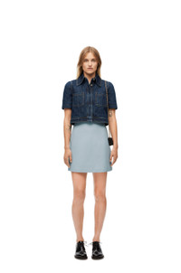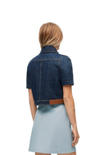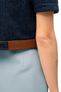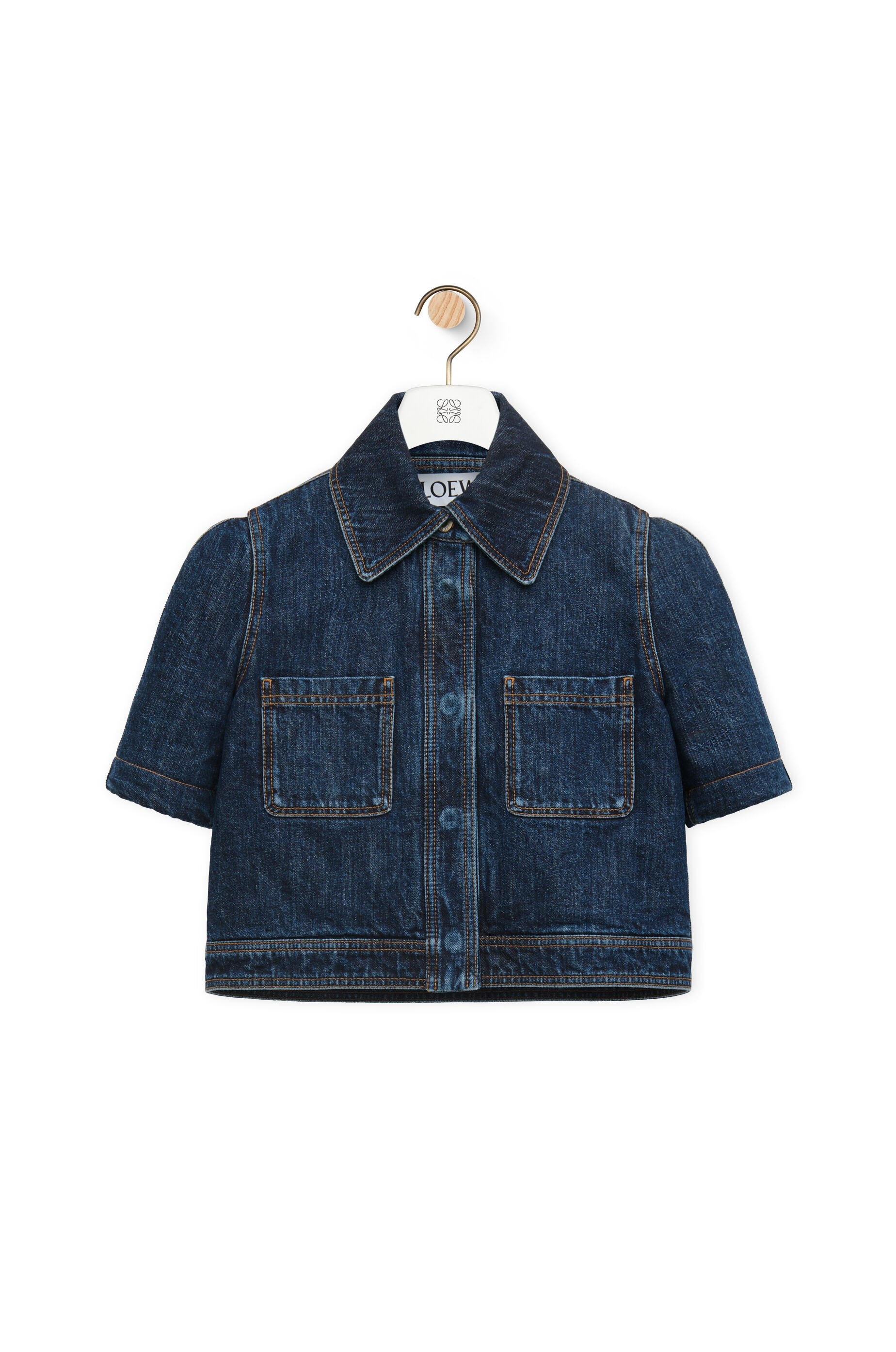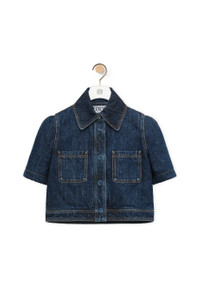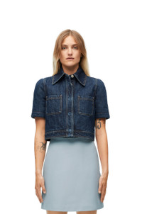 Jacket crafted in medium-weight rinsed raw denim. - Small fit - Short length - Reproportioned silhouette - Classic collar - Short sleeves - Concealed button front placket with bleached button outline - Chest patch pockets - Tobacco topstitching - Quilted lining with light padding - LOEWE embossed leather patch at the back Details - Colour: Raw Denim - Main material: Cotton - Weight: 0.7 kg - Model ID: S540Y50X32 - Made in: Italy