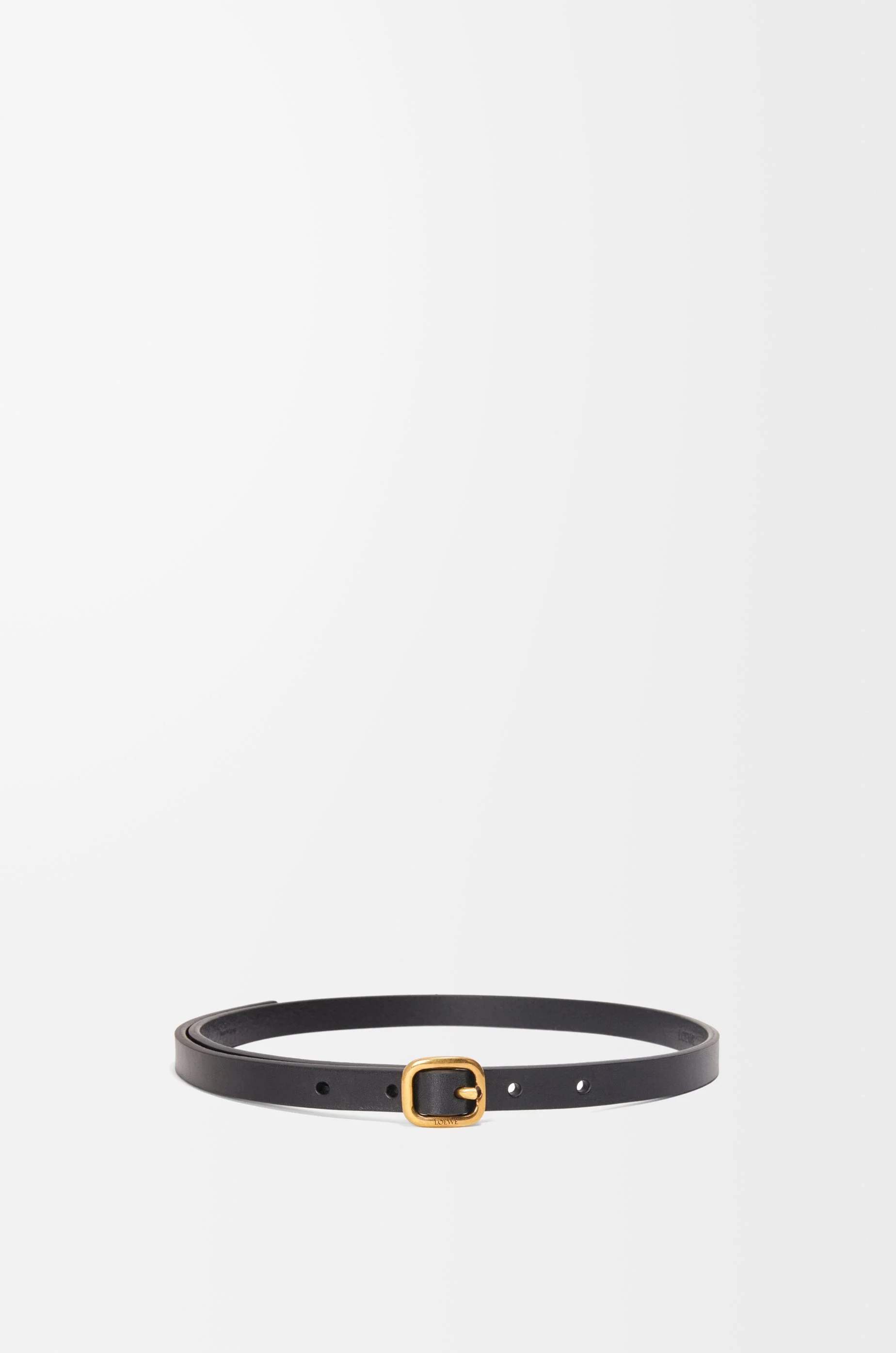 Rounded soft belt in vegetable-tanned classic calfskin with a LOEWE engraved buckle. - Due to its treatment, this leather will age naturally and develop a unique patina over time. - 1.5cm wide - Five holes regulation Details - Colour : Black - Metallic colour : Gold - Main material : Classic Calf - Weight : 0.08 kg - Height (cm) : 0.3 - Width (cm) : 93 - Depth (cm) : 1.5 - Height (inch) : 0.1 - Width (inch) : 36.6 - Depth (inch) : 0.6 - Model ID : E619Z16X18 - Made in : Spain