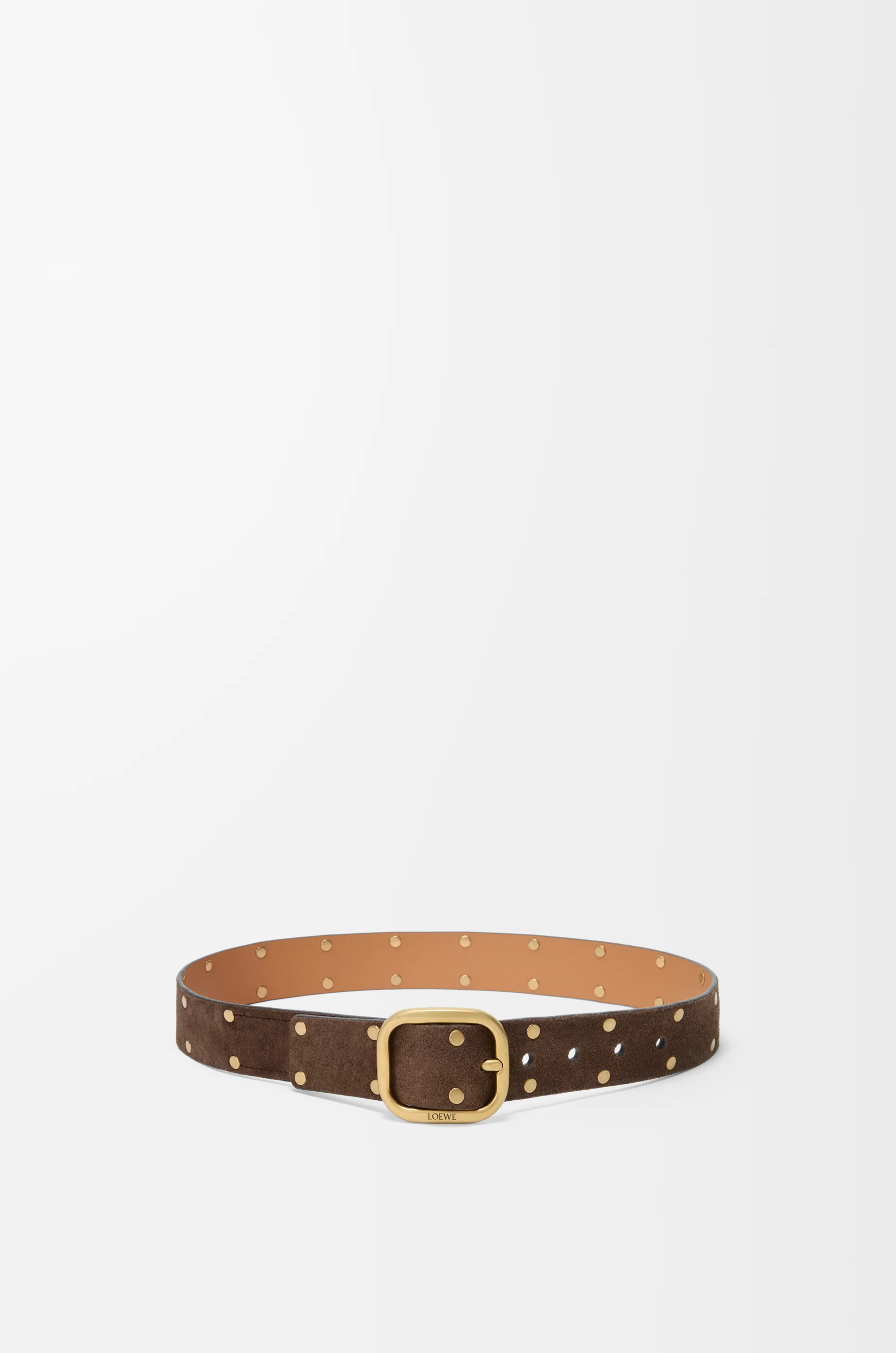 Rounded soft belt in suede calfskin with allover stud embellishments. - Rounded buckle - Pin buckle - 3.5cm wide - Five holes regulation - Engraved LOEWE Colour: Wood/Vintage Gold Metallic colour: Gold Main material: Suede Weight: 0.15 kg Depth: 3.5 cm Made in: Spain