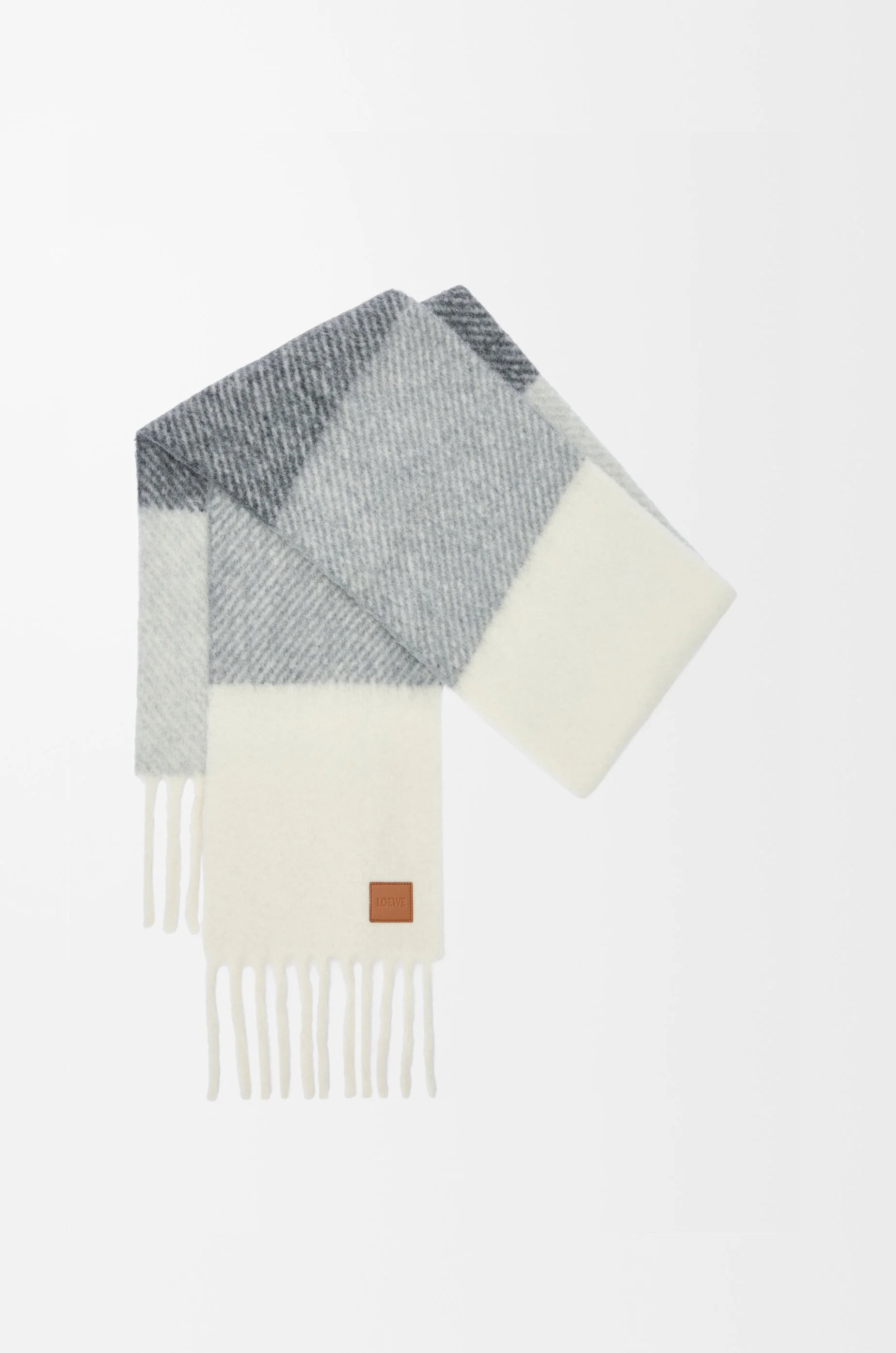 Scarf in medium-weight brushed alpaca and wool blend featuring multitone jacquard twill stripes. 27cm x 212cm - Fringed edges - LOEWE embossed leather patch placed on the corner Colour: Grey/White Main material: Alpaca/Wool Weight: 0.238 kg Height: 212 cm Width: 27 cm Made in: Italy