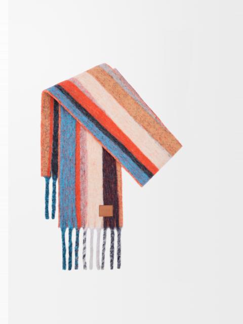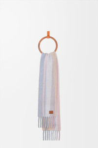 Scarf in medium-weight brushed alpaca and wool blend featuring multitone jacquard stripes. - 23cm x 185cm - Chunky fringed edges - LOEWE embossed leather patch placed on the corner Colour: Light Blue/Pink/Sandstone Main material: Alpaca/wool Weight: 0.26 kg Height: 190 cm Width: 25 cm Made in: Italy