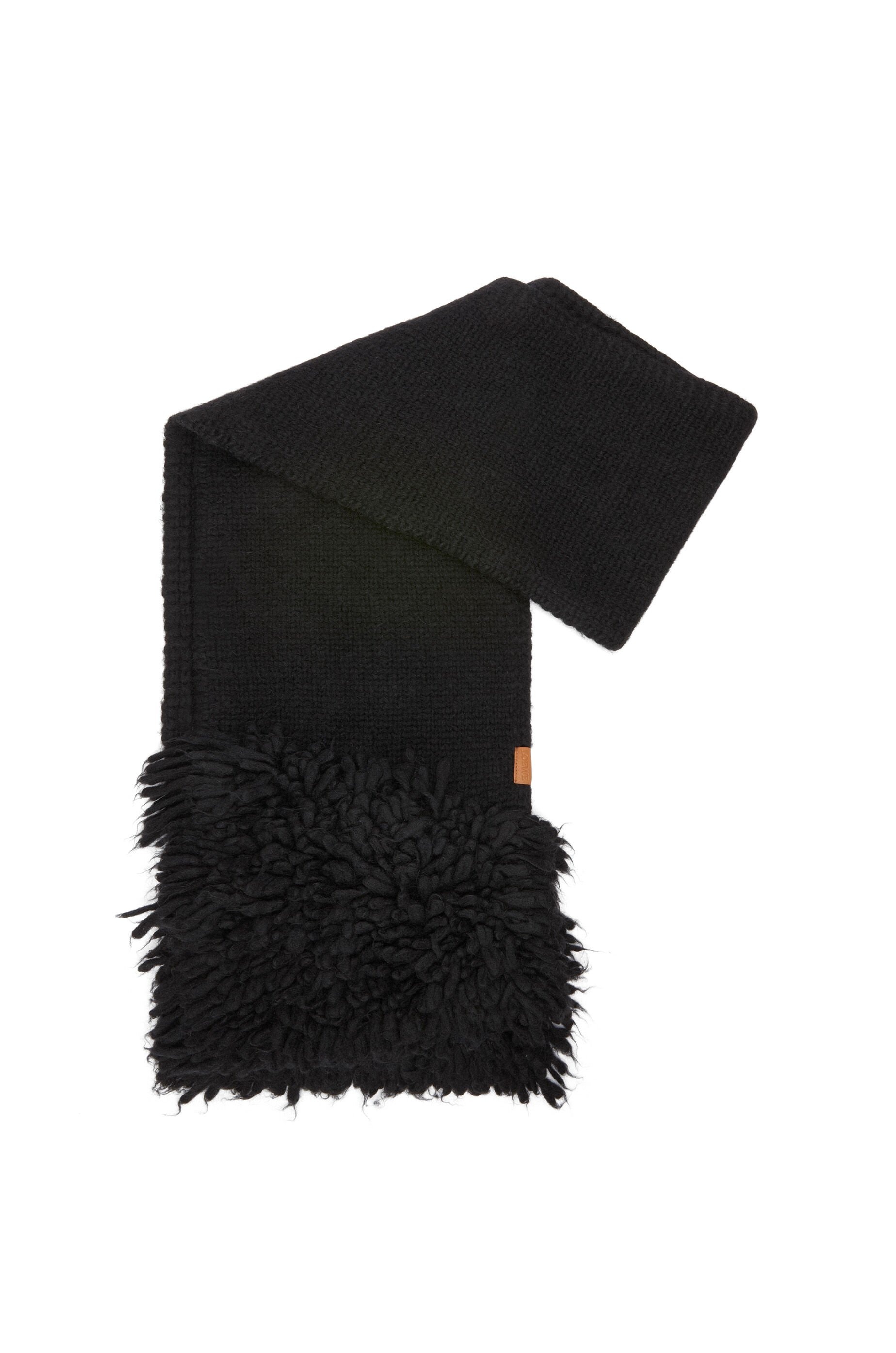 Scarf crafted in alpaca blend textured knit. - 26cm x 210cm - Loop stitch panels - LOEWE leather tab placed on the side edge Details - Colour : Black - Main material : Alpaca/Polyamid - Weight : 0.47 kg - Height (cm) : 210 - Width (cm) : 26 - Height (inch) : 82.7 - Width (inch) : 10.2 - Model ID : F540257X30 - CIL : - 0011170537 - Made in : Italy