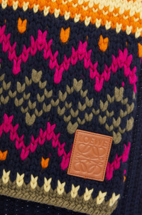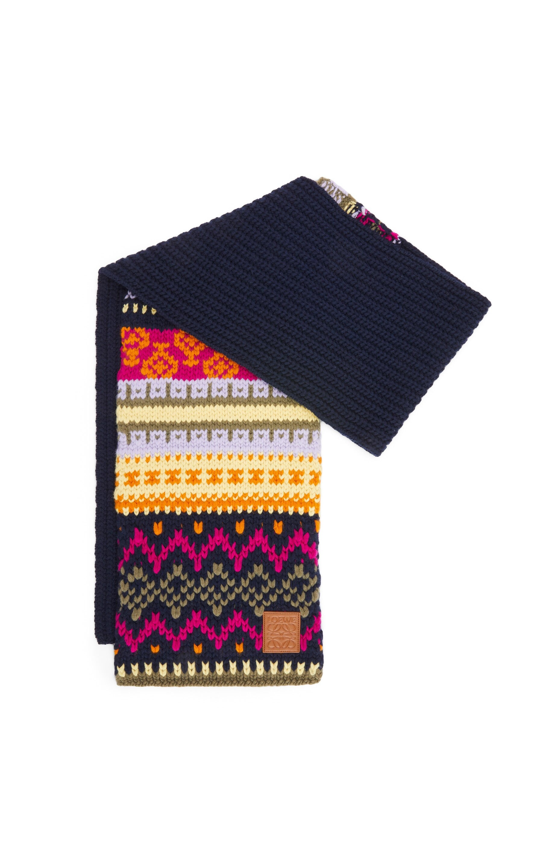 Scarf crafted in wool knit with multicolour jacquard stitch. - 27cm x 180cm - Mixed gauge knit - Multicoloured jacquard pattern - LOEWE Anagram leather patch placed on the corner Details - Colour : Dark Blue/Multicolor - Main material : Wool/Calf - Weight : 0.334 kg - Height (cm) : 180 - Width (cm) : 27 - Height (inch) : 70.9 - Width (inch) : 10.6 - Model ID : F811257XAB - CIL : - 0011081080 - Made in : Italy