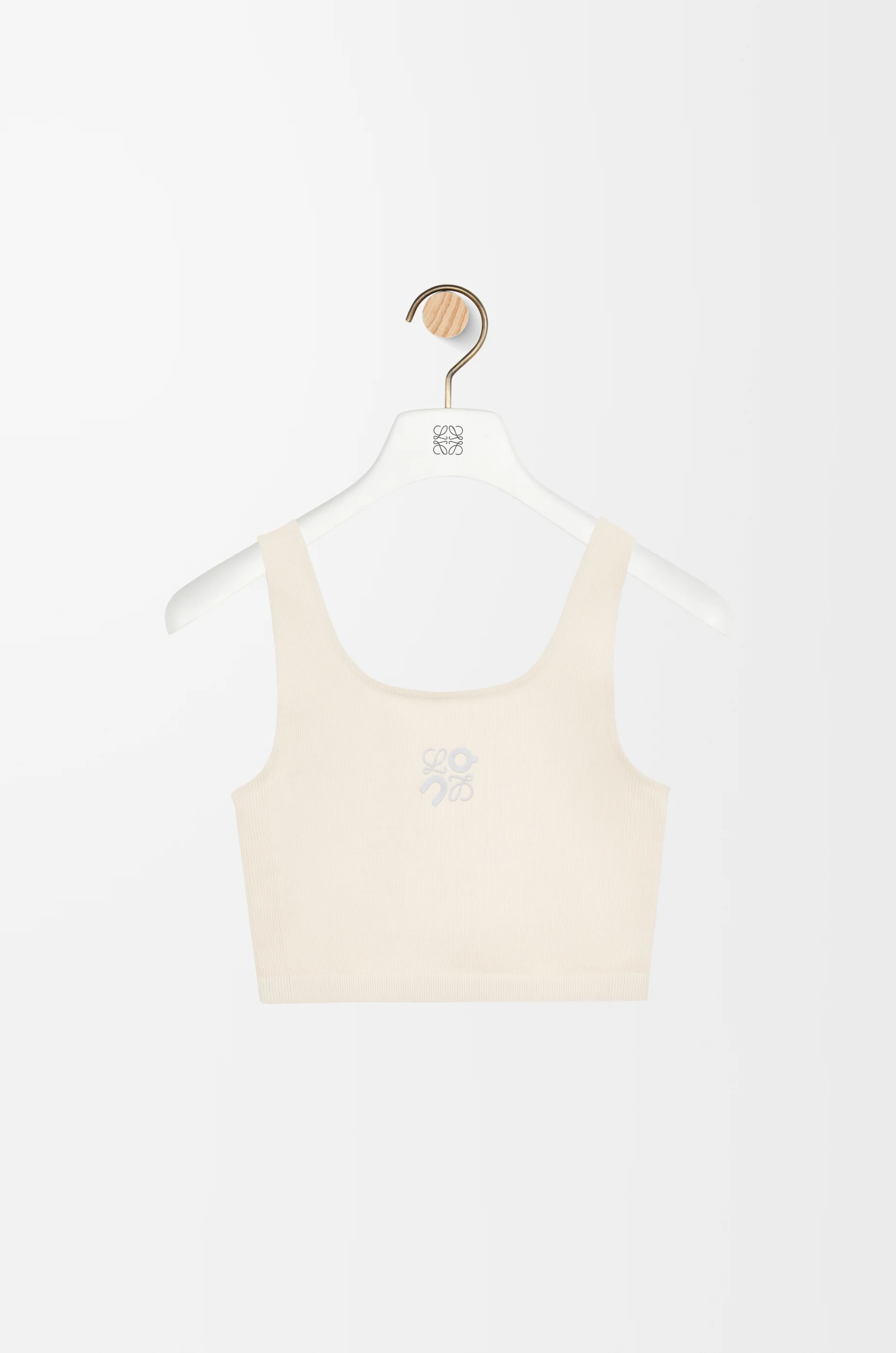 Bra in lightweight textured sculpting stretch technical jersey featuring a seamless knit construction and offering light support for low impact activities. - Slim fit, cropped length - Scoop neck and back - Elasticated hem - Reflective Anagram On print placed at the front - Reflective LOEWE On print placed at the back Colour: Ivory Main material: Nylon/Polyester/Elasthane Weight: 0.1 kg Materials & care Main Material: 89% polyamide 11% elastane