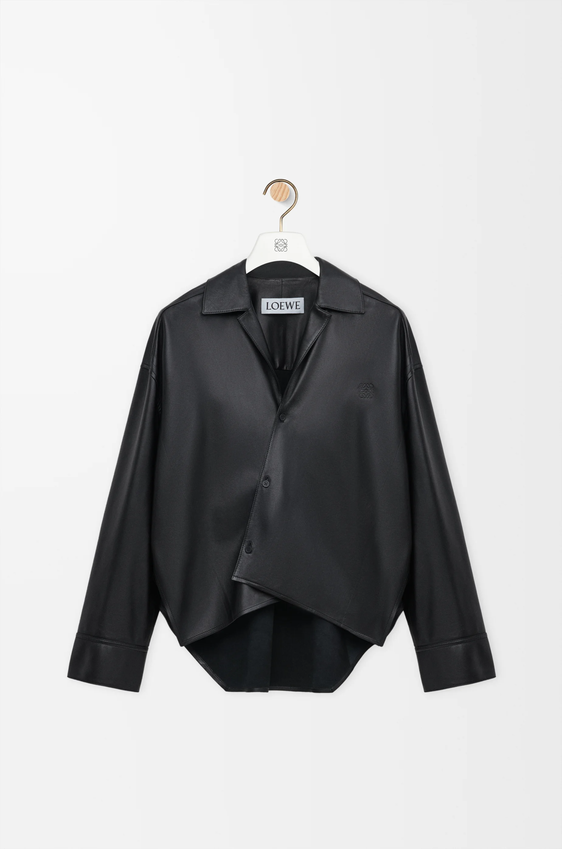 Shirt in lightweight nappa lambskin featuring an asymmetric front with a diagonal placket. - Relaxed fit, regular length - Camp collar - Button front fastening, buttoned cuffs - Embossed Anagram placed on the chest Colour: Black Main material: Nappa Weight: 0.59 kg Made in: Spain Materials & care Main Material: 100% lambskin