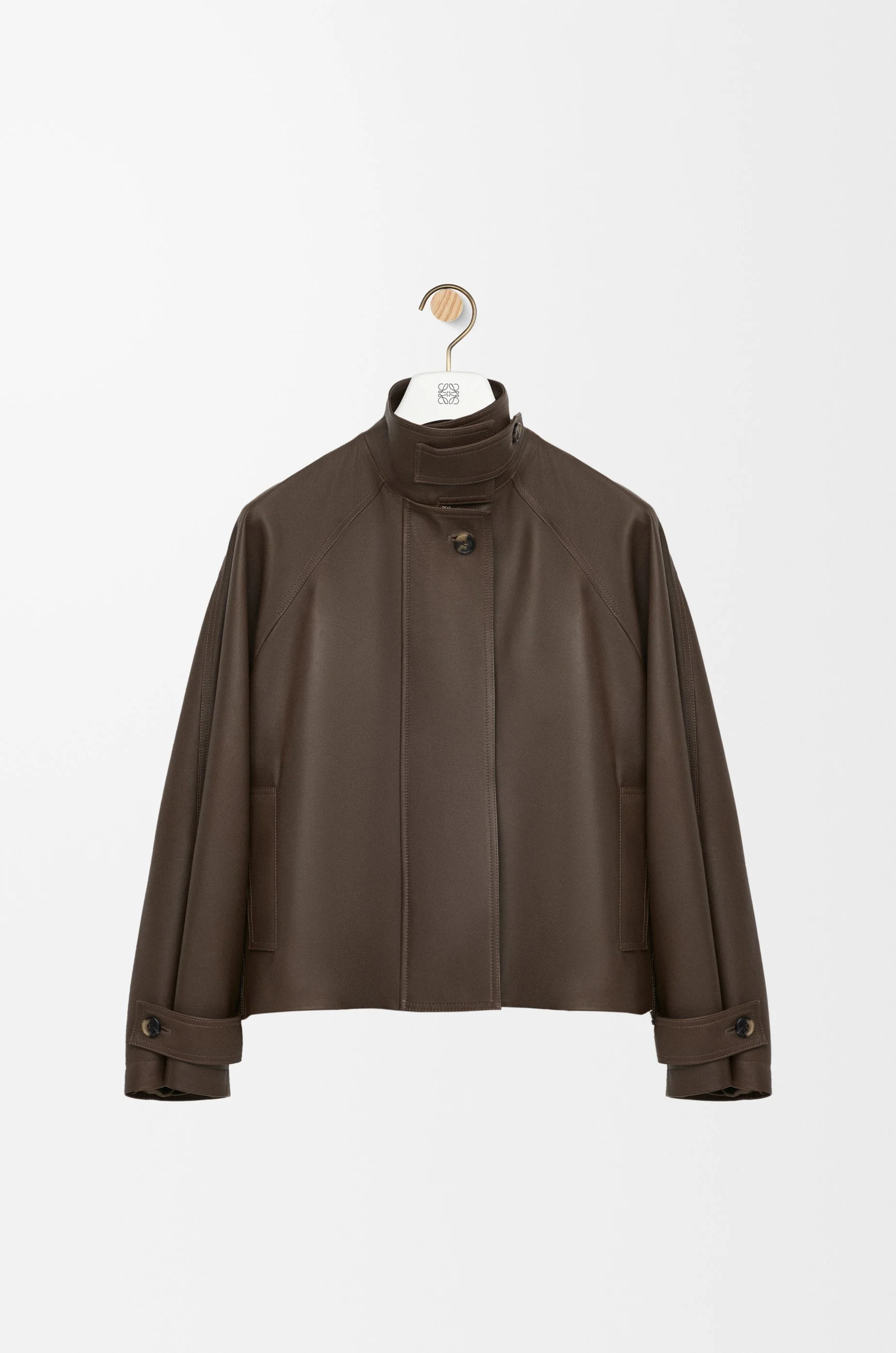 Parka in medium-weight nappa calfskin featuring a high neck with a throat latch. - Relaxed fit, short length - Raglan sleeves - Concealed zip front fastening - Buttoned tabs at the waist and cuffs - Diagonal welt pockets, inside welt pocket - Fully lined - LOEWE Anagram embossed leather patch placed at the back Colour: Dark Green Main material: Nappa Weight: 1.61 kg Made in: Spain Materials & care Main Material: 100% calf skin