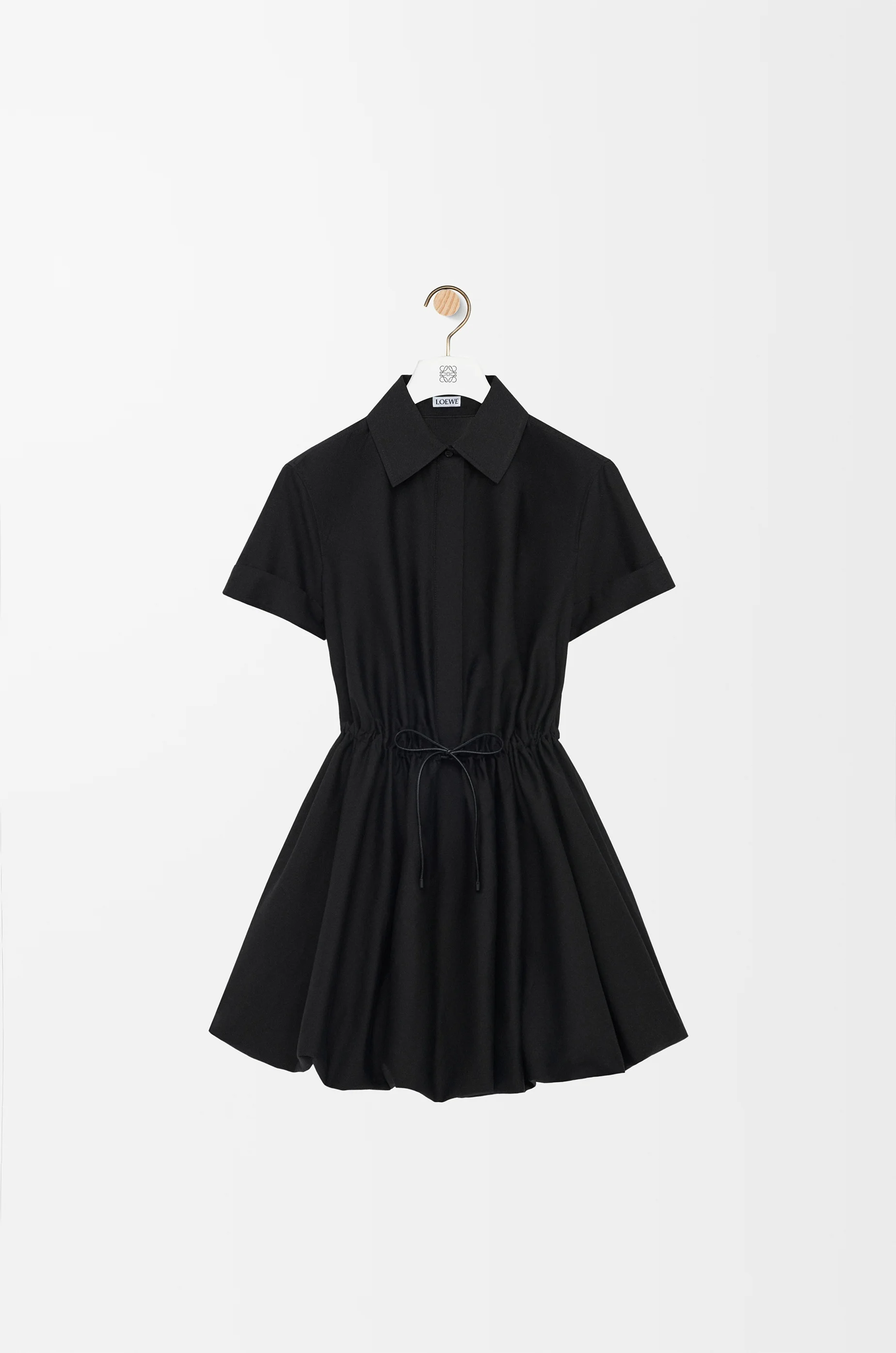 Dress in lightweight cotton and silk gabardine featuring an elasticated waist with a leather drawstring and a puffed hem. - Regular fit, short length - Classic collar - Button front fastening - Cuffed sleeves - Seam pockets - LOEWE Anagram embossed leather patch placed at the back Colour: Black Main material: Cotton/Silk Weight: 0.5 kg Made in: Italy Materials & care Main Material: 85% cotton 15% silk