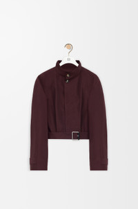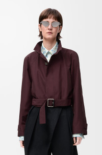 Trench in lightweight cotton blend ottoman featuring a high collar and an adjustable buckle belt at the hem. - Regular fit, short length - Concealed button front fastening - Raglan sleeves, cuff tabs - Vertical welt pockets, inside welt pocket - Fully lined - LOEWE Anagram embossed leather patch placed at the back Colour: Burgundy Main material: Cotton/Polyamide Weight: 0.5 kg Made in: Italy Materials & care Main Material: 60% cotton 40% polyamide