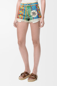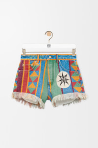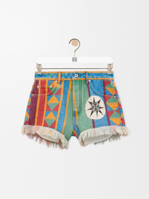 Shorts in medium-weight washed cotton denim featuring an exclusive compass print with a placed Anagram and a frayed hem. - Regular fit, mini length - Mid waist - Five pocket style - Concealed button fly - Frayed hem - LOEWE embossed leather patch placed at the back Colour: Multicolor Main material: Cotton Weight: 0.3 kg Made in: Italy