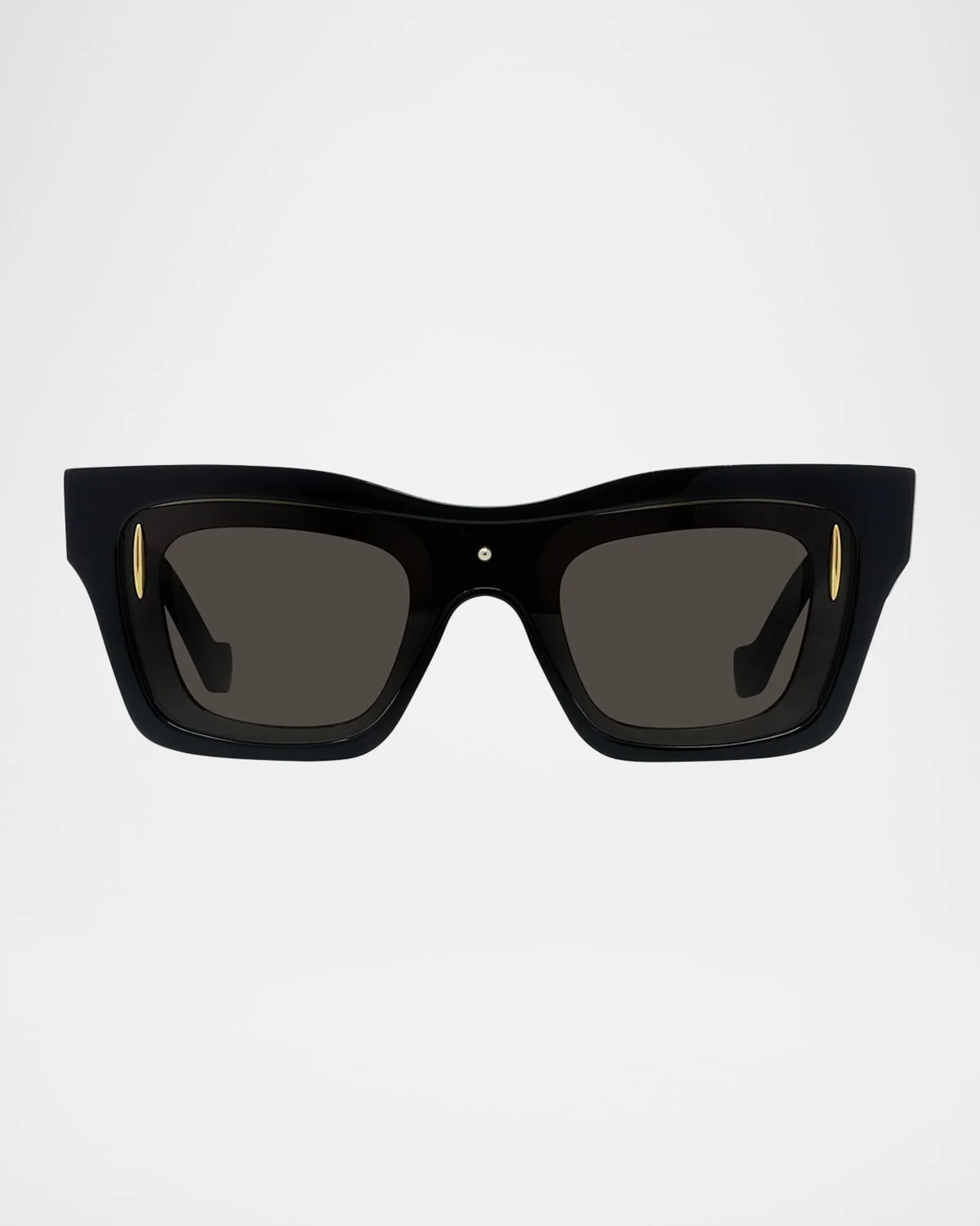 Loewe rectangleshaped sunglasses featuring a thick metal rim around the lenses and metal stitches on the front Eye/bridge/temple (in mm): 5317145 Solid lenses Saddle nose bridge Wide, tapered arms Classic logo on the temples Acetate 100% UVA/UVB protection Made in Italy