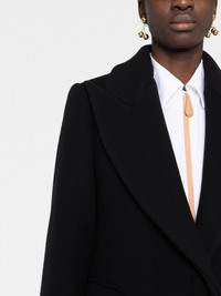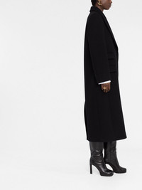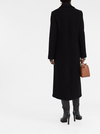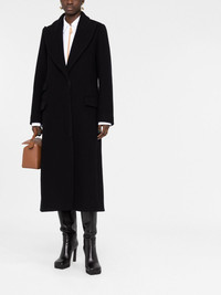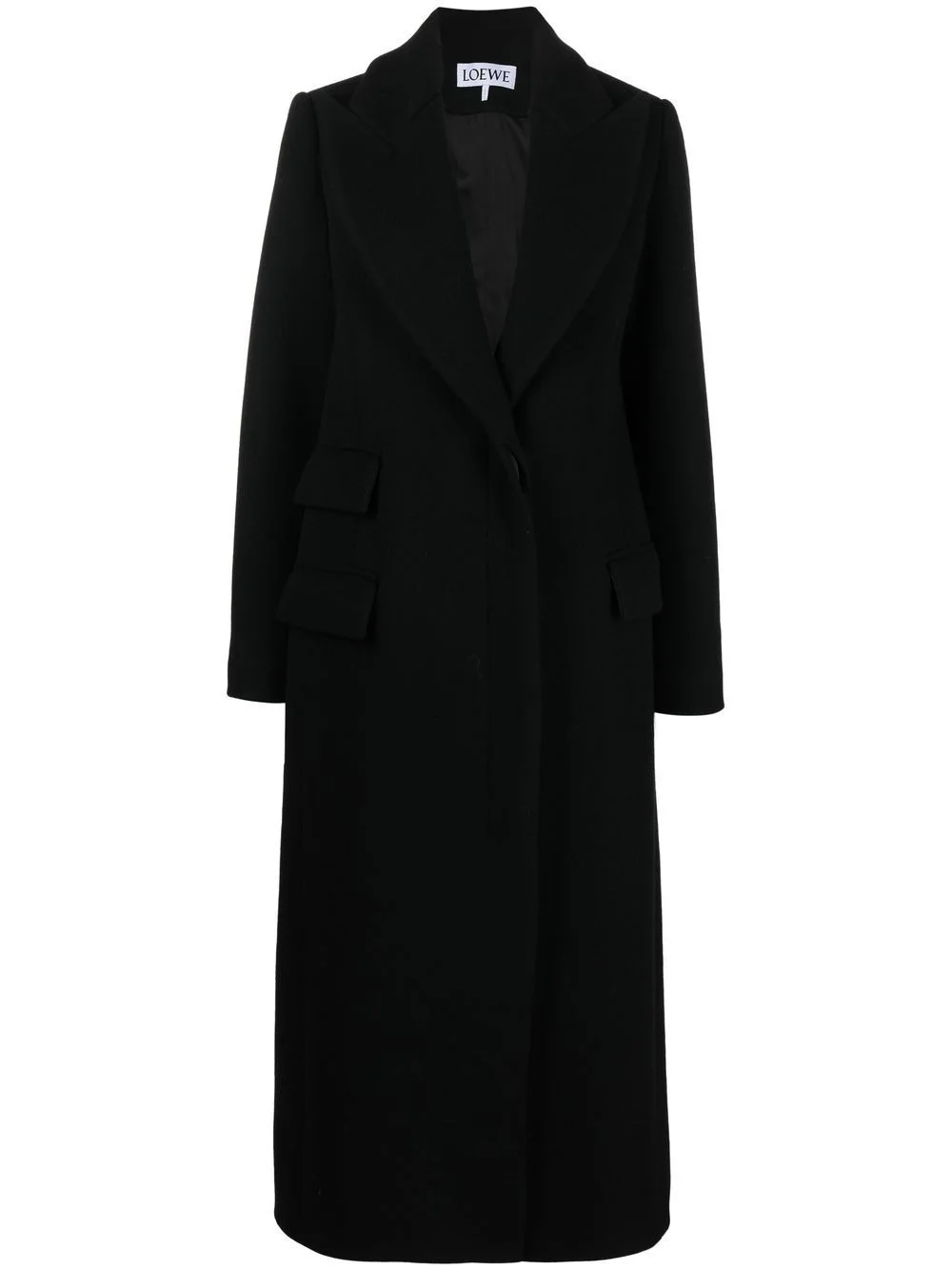 single-breasted wool coat Crafted from wool in a classic black hue, this Loewe coat is crafted to a long length with exaggerated peak lapels for timeless style. Made in Italy Composition Lining: Viscose 53%, Cupro 47% Outer: Wool 100% SIZE & FIT Model measurements Height 5 ft 10 in(1.77 m) Bust/Chest 32.28 in(82 cm) Hips 35.03 in(89 cm) Waist 25.19 in(64 cm) FittingInformation This piece fits true to size. We recommend you get your regular size Cut for a loose fit Made with a mid-weight non-stretch fabric Washing instructions Dry Clean Only