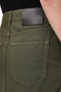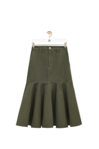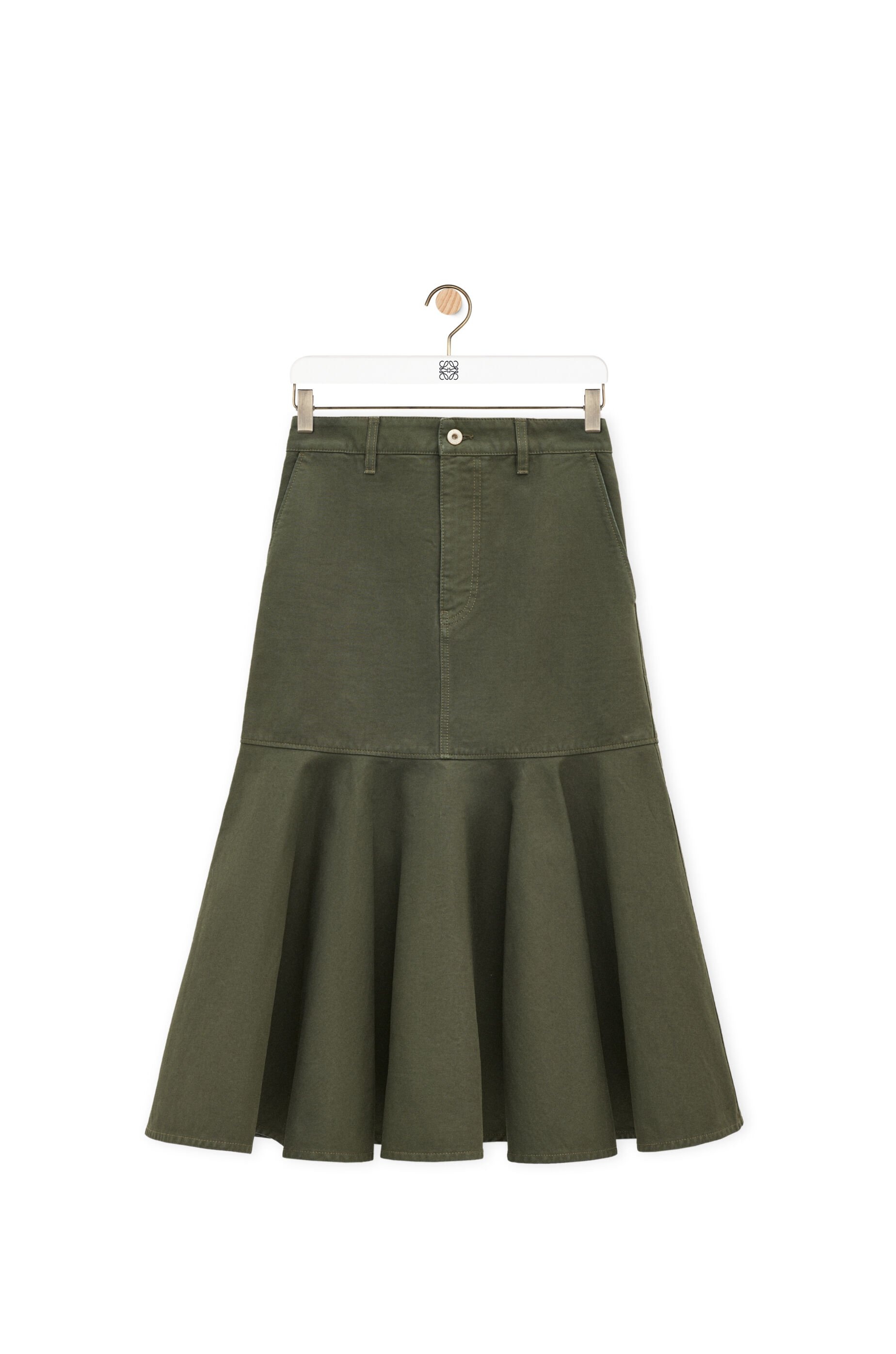 Skirt in medium-weight garment-dyed cotton twill featuring a flared hem silhouette. - Regular fit, knee length - Mid waist - Concealed zip fly - Slash pockets, rear patch pockets - Partially lined - LOEWE embossed leather patch placed at the back Details - Colour : Khaki Green - Main material : Cotton - Weight : 1.0 kg - Model ID : S359Y08X75 - Made in : Italy