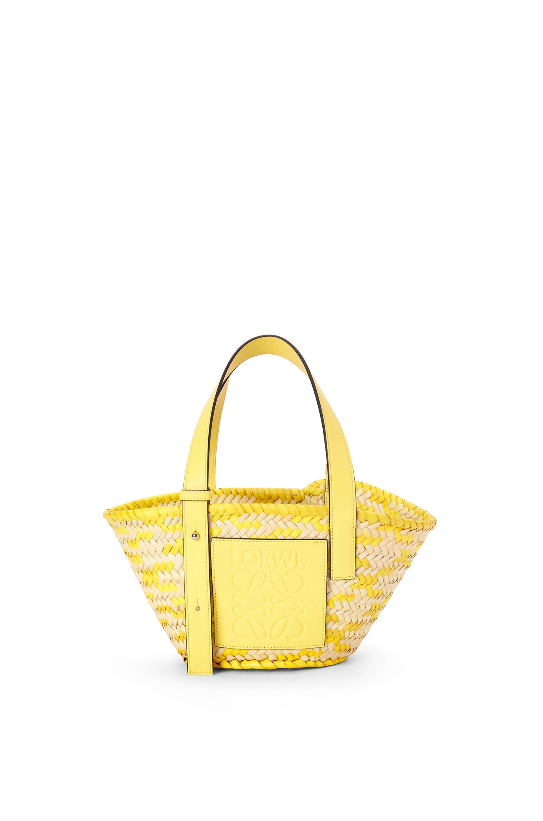 A traditional basket bag elevated with a classic handwoven body and beautifully crafted calfskin top handles. This small version is crafted in palm leaf and calfskin. - Shoulder or top handle carry - Adjustable top handles - Customisable with strap and personalised charms - Unlined - Embossed Anagram patch - Due to its handcrafted nature, sizes may differ slightly, making every purchase unique Details - Colour: Natural/Lemon - Metallic colour: Palladium - Main material: Palm Leaf/Calf - Handle drop: 20 cm - Weight : 0.26 kg - Height (cm): 17 - Width (cm): 33 - Depth (cm): 13 - Height (inch): 6.7 - Width (inch): 13 - Depth (inch): 5.1 - Model ID: A223S93X18 - CIL: 0010698041 - Made in: Spain