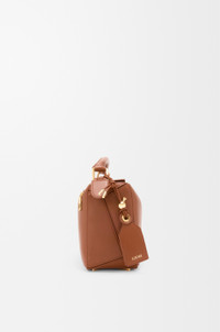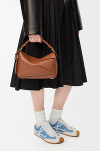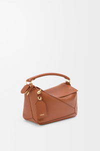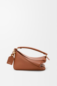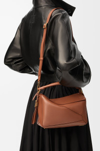 The Featherlight Puzzle is defined by its distinctive geometric lines and its cuboid form. The supple featherlight nappa makes the bag soft and slouchy. - Shoulder, crossbody or hand carry - Detachable and adjustable strap with rotating dogclips - Zip closure with articulated pulls - One external zipped rear pocket, one internal slip pocket - Detachable LOEWE gold or silver embossed tag with secret pocket and balloon dice - Baguette-shaped metal feet - Nappa lambskin lining - Embossed Anagram, LOEWE engraved internal plaque Colour: Pecan Metallic colour: Gold Main material: Featherlight Nappa Lambskin Strap length: 92 -112 cm Strap drop: 46 - 56 cm Handle drop: 7 cm Weight: 0.5 kg Height: 16.5 cm Width: 24 cm Depth: 10.5 cm Made in: Spain