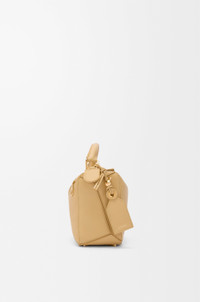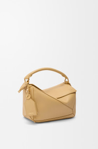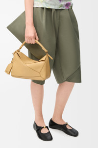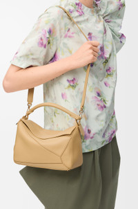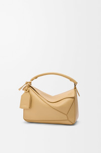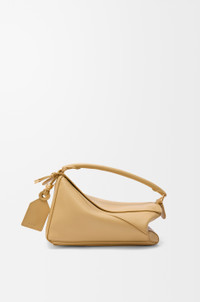 The Featherlight Puzzle is defined by its distinctive geometric lines and its cuboid form. The supple featherlight nappa makes the bag soft and slouchy. - Shoulder, crossbody or hand carry - Detachable and adjustable strap with rotating dogclips - Zip closure with articulated pulls - One external zipped rear pocket, one internal slip pocket - Detachable LOEWE gold or silver embossed tag with secret pocket and balloon dice - Baguette-shaped metal feet - Nappa lambskin lining - Embossed Anagram, LOEWE engraved internal plaque Colour: Dark Butter Metallic colour: Gold Main material: Featherlight Nappa Lambskin Strap length: 92 -112 cm Strap drop: 46 - 56 cm Handle drop: 7 cm Weight: 0.5 kg Height: 16.5 cm Width: 24 cm Depth: 10.5 cm Made in: Spain