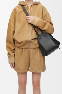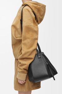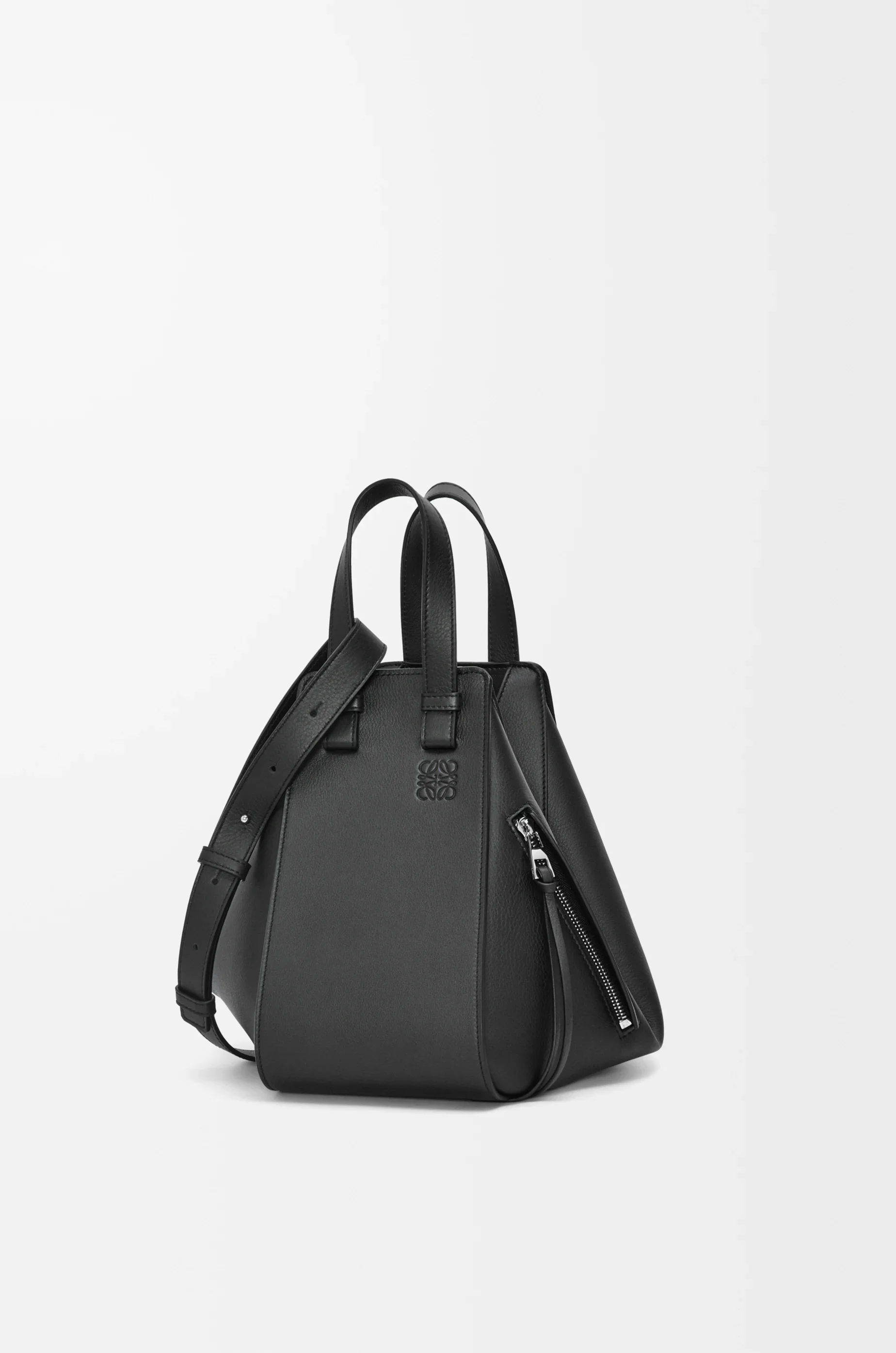 The Hammock is a versatile design whose flexible sides fold in and out to create distinctive silhouettes. This small version is crafted in classic calfskin. - Shoulder, crossbody or hand carry - Detachable and adjustable strap, top handle - Internal hook closure - One external zip pocket, two internal slip pockets - Herringbone cotton canvas lining - Embossed Anagram Colour: Black Metallic colour: Palladium Main material: Classic Calf Strap length: 90 - 105 cm Strap drop: 49 - 57 cm Handle drop: 10 cm Weight: 0.65 kg Height: 25 cm Width: 13.5 cm Depth: 30 cm Made in: Spain