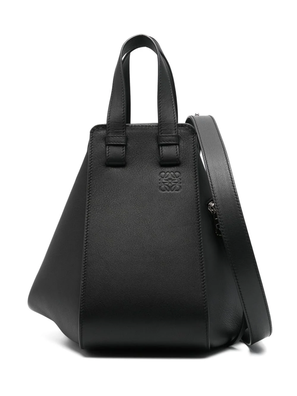 small Hammock tote bag LOEWE updates its iconic Hammock bag in understated black leather. The brand's best-loved style can be carried in-hand or worn on one shoulder. Highlights - Black - Leather - Smooth grain - Two top handles - Adjustable detachable shoulder strap - Signature anagram plaque - Open top - Decorative zip detailing - Main compartment - Debossed internal logo - Full lining - This piece comes complete with a protective dust bag. Imported Composition Lining: Cotton 55%, Linen/Flax 45% Outer: Leather 100% SIZE & FIT Model measurements Height 5 ft 9 in(1.74 m) Bust/Chest 34.64 in(88 cm) Hips 36.61 in(93 cm) Waist 26.37 in(67 cm) Measurement DEPTH 9.44 in(24 cm) HEIGHT 9.84 in(25 cm) STRAP 19.68 in(50 cm) WIDTH 11.81 in(30 cm)