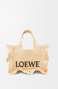 The LOEWE Font tote is a cuboid bag with a contrasting LOEWE signature. It is made in Spain using raffia palm leaves cultivated and handwoven by artisans in Madagascar. This small version features ruffles. - Shoulder, crossbody or hand carry - Detachable and adjustable strap - Unlined Colour: Natural Metallic colour: Gold Main material: Raffia Strap length: 107 - 117 cm Strap drop: 52 - 57 cm Handle drop: 16 cm Weight: 0.57 kg Height: 19.5 cm Width: 24 cm Depth: 11 cm
