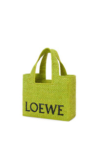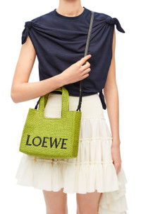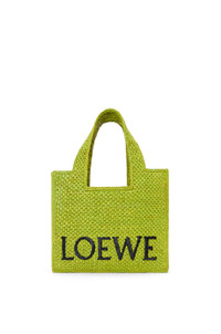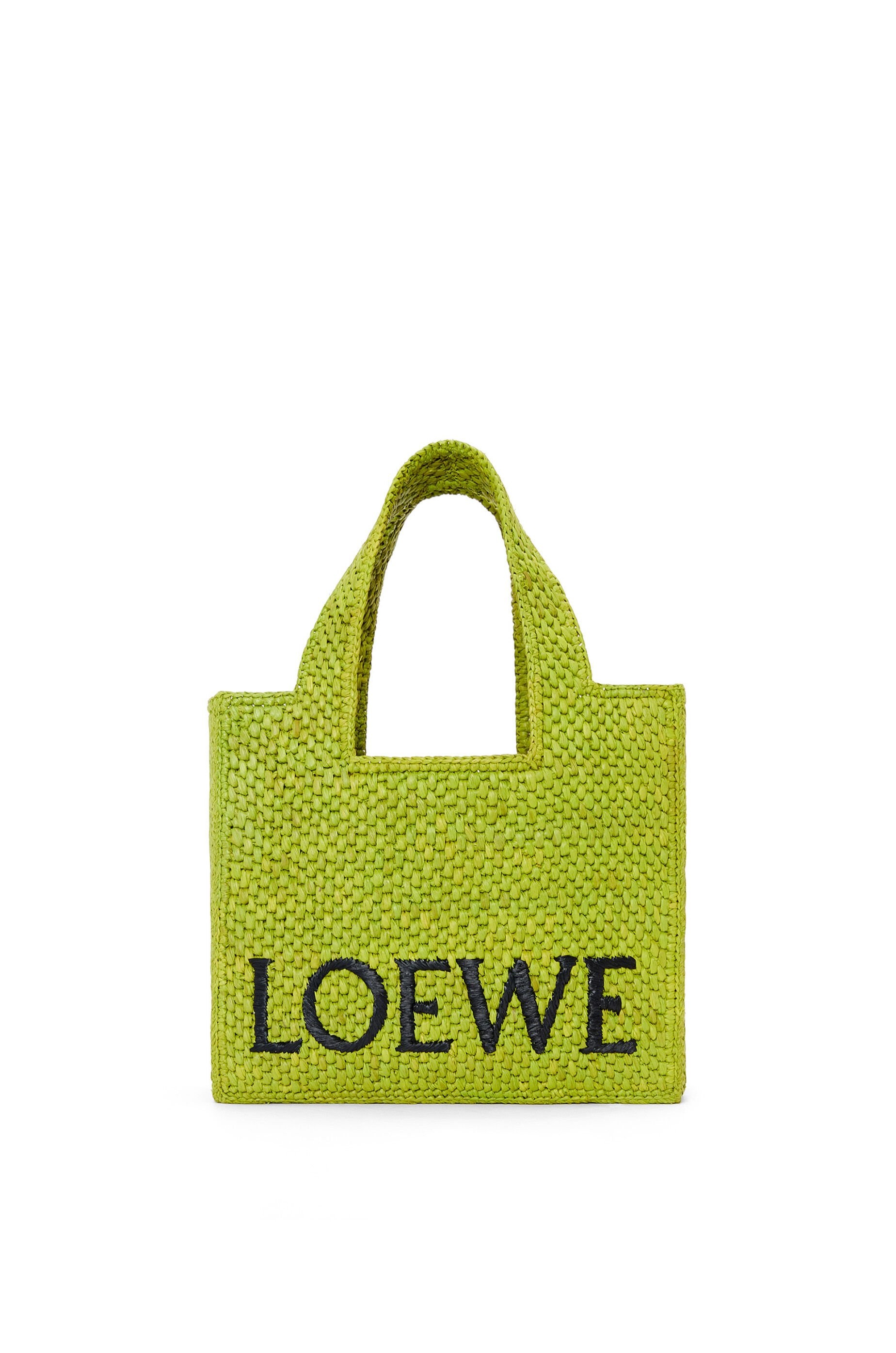 The LOEWE Font Tote is a cuboid bag adorned with a contrasting LOEWE signature. This small version is made in Spain using raffia palm that is cultivated, harvested, sun-dried and woven in Madagascar by local artisans. - Hand carry or shoulder carry - Detachable and adjustable shoulder strap - Unlined Details - Colour: Meadow Green - Metallic colour: Gold - Main material: Raffia - Strap length: 107 - 117 cm - Handle drop: 16 cm - Weight: 0.46 kg - Height (cm): 19.5 - Width (cm): 24 - Depth (cm): 11 - Height (inch): 7.7 - Width (inch): 9.4 - Depth (inch): 4.3 - Model ID: A685B59X01 - CIL: 0011051992 - Made in: Madagascar