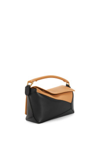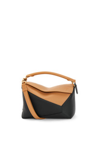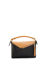 The Puzzle bag is the debut bag for LOEWE by Creative Director Jonathan Anderson. A cuboid shape and precise cutting technique create Puzzle’s distinctive geometric lines. This small bicolour version is crafted in classic calfskin. - Shoulder, crossbody or hand carry - Detachable and adjustable shoulder strap - Internal slip pocket and external zip pocket at the back - Customisable with strap and personalisation charms - Embossed Anagram Details - Colour: Warm Desert/Black - Metallic colour: Gold - Main material: Classic Calf - Strap length: 80.5 - 115.5 cm - Handle drop: 7 cm - Weight: 0.52 kg - Height (cm): 16.5 - Width (cm): 24 - Depth (cm): 10.5 - Height (inch): 6.5 - Width (inch): 9.4 - Depth (inch): 4.1 - Model ID: A510P60X44 - CIL: 0010947398 - Made in: Spain