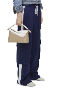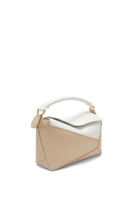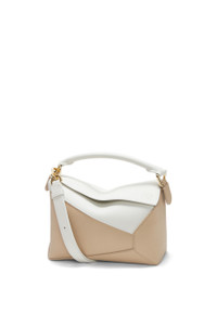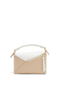 The Puzzle bag is the debut bag for LOEWE by Creative Director Jonathan Anderson. A cuboid shape and precise cutting technique create Puzzle’s distinctive geometric lines. This small bicolour version is crafted in classic calfskin. - Shoulder, crossbody or hand carry - Detachable and adjustable shoulder strap - Internal slip pocket and external zip pocket at the back - Customisable with strap and personalisation charms - Embossed Anagram Details - Colour: Soft White/Paper Craft - Metallic colour: Gold - Main material: Classic Calf - Strap length: 80.5 - 115.5 cm - Handle drop: 7 cm - Weight: 0.52 kg - Volume: SS24 Spring Drop 2 - Height (cm): 16.5 - Width (cm): 24 - Depth (cm): 10.5 - Height (inch): 6.5 - Width (inch): 9.4 - Depth (inch): 4.1 - Model ID: A510P60X44 - CIL: 0010968592 - Made in: Spain