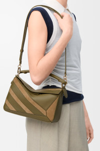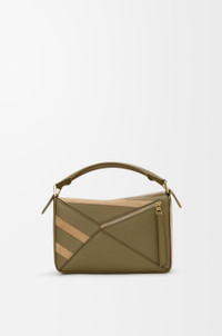 The Puzzle is defined by its distinctive geometric lines and its cuboid form. This small version is crafted in classic calfskin and suede with intarsio stripes in a colourway-specific pattern. - Shoulder, crossbody or hand carry - Detachable and adjustable strap - Zip closure with calfskin pull - One external zip rear pocket, one internal slip pocket - Suede lining - Embossed Anagram Colour: Olive/Gold Metallic colour: Gold Main material: Classic Calf/Suede Strap length: 80.5 - 115.5 cm Strap drop: 40 - 58 cm Handle drop: 7 cm Weight: 0.5465 kg Height: 16.5 cm Width: 24 cm Depth: 10.5 cm Made in: Spain