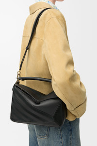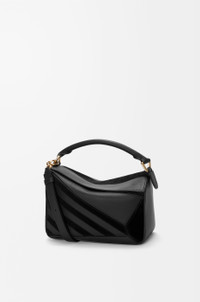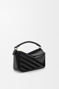 The Puzzle is defined by its distinctive geometric lines and its cuboid form. This small version is crafted in classic calfskin and suede with intarsio stripes in a colourway-specific pattern. - Shoulder, crossbody or hand carry - Detachable and adjustable strap - Zip closure with calfskin pull - One external zip rear pocket, one internal slip pocket - Suede lining - Embossed Anagram Colour: Black Metallic colour: Gold Main material: Classic Calf/Suede Strap length: 80.5 - 115.5 cm Strap drop: 40 - 58 cm Handle drop: 7 cm Weight: 0.5195 kg Height: 16.5 cm Width: 24 cm Depth: 10.5 cm Made in: Spain