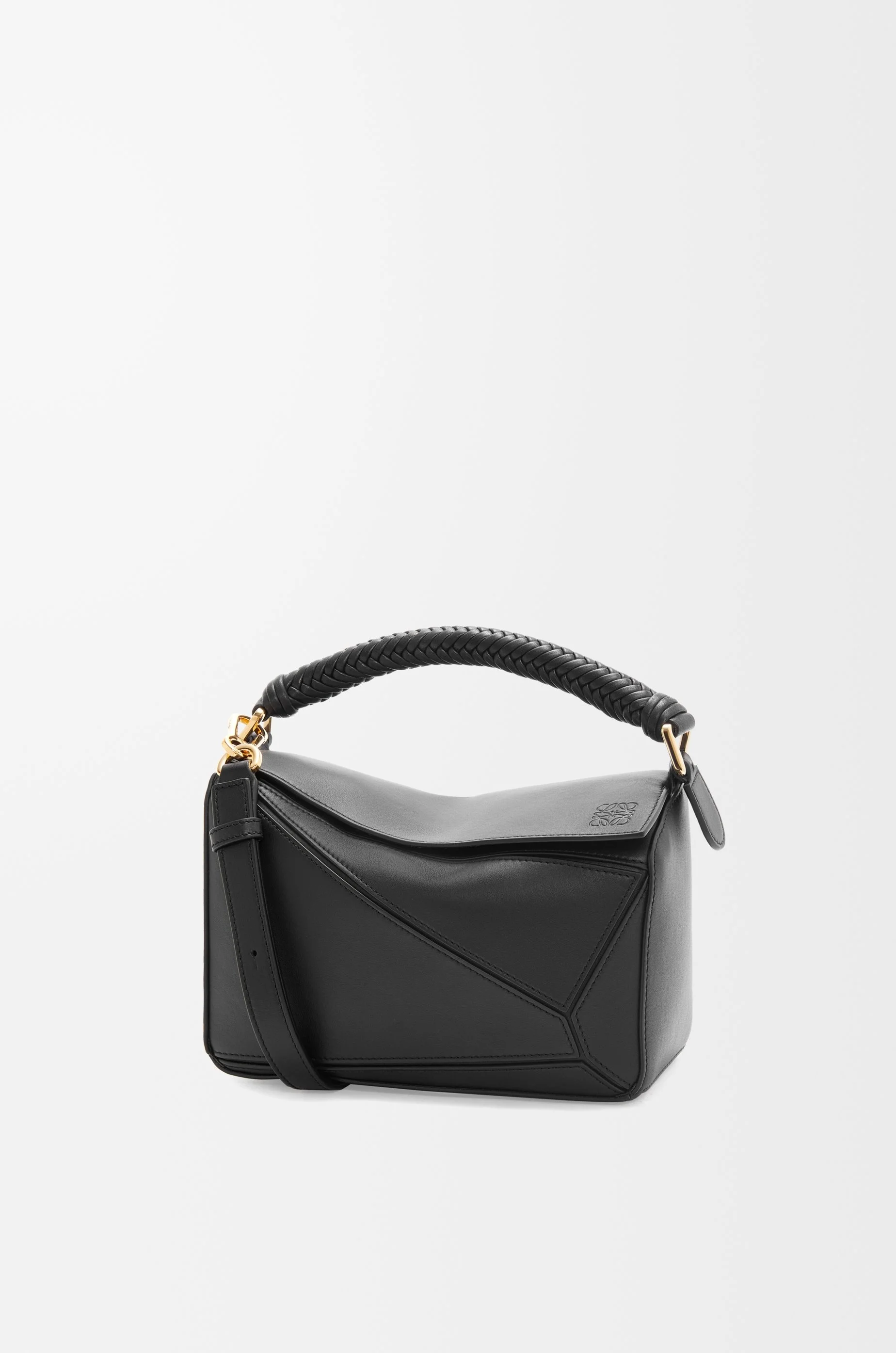 The Puzzle is defined by its distinctive geometric lines and its cuboid form. This small version is crafted in smooth calfskin with a woven handle and knotted puller. - Shoulder, crossbody, top handle or clutch carry - Detachable and adjustable strap - Zip closure with calfskin pull - One external zip rear pocket, one internal slip pocket - Herringbone cotton canvas lining - Embossed Anagram Colour: Black Metallic colour: Gold Main material: Mellow Calf/Lambskin Strap length: 80.5 - 115.5 cm Strap drop: 40 - 58 cm Handle drop: 7 cm Weight: 0.52 kg Height: 16.5 cm Width: 24 cm Depth: 10.5 cm Made in: Spain