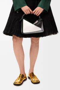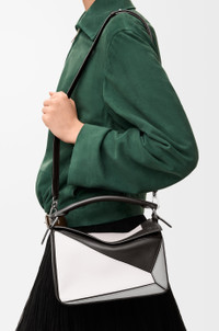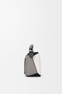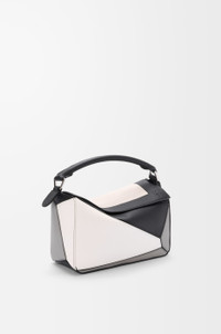 The Puzzle is defined by its distinctive geometric lines and its cuboid form. This small version is crafted in nappa calfskin with intarsio squares inspired by Josef Albers's "Homage to the Square" series. This bag is part of the LOEWE x Albers collection. - Shoulder, crossbody or hand carry - Detachable and adjustable strap - Zip closure with calfskin pull - One external zip rear pocket, one internal slip pocket - Suede lining - Embossed Anagram, silver embossed LOEWE and Anni Albers signature Colour: Grey/Light Ghost Metallic colour: Palladium Main material: Nappa Calf Strap length: 80.5 - 115.5 cm Strap drop: 40 - 58 cm Handle drop: 7 cm Weight: 0.52 kg Height: 16.5 cm Width: 24 cm Depth: 10.5 cm Made in: Spain