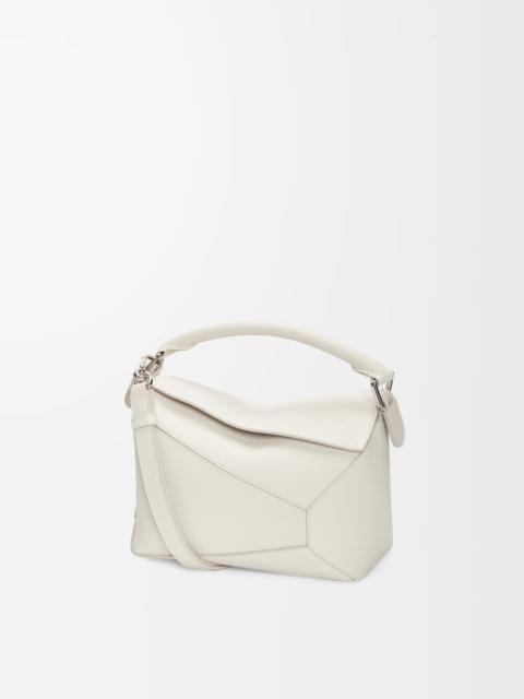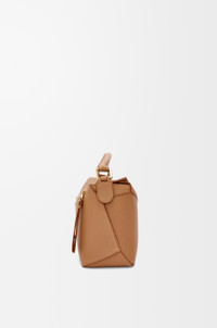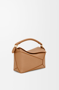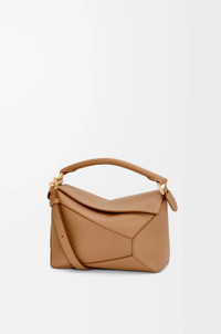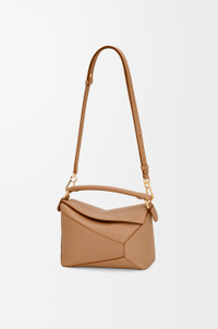 The Puzzle bag is the debut bag for LOEWE by Creative Director Jonathan Anderson. A cuboid shape and precise cutting technique create Puzzle’s distinctive geometric lines. This small version is crafted in soft grained calfskin with overlapped edges. - The small Puzzle can hold for example a large wallet, all mobile phones and sunglasses - Shoulder, crossbody, top handle or clutch carry - Removable and adjustable shoulder strap - Zip closure with calfskin pull - Exterior zip rear pocket and one internal slip pockets - Customisable with strap and personalisation charms - Herringbone cotton canvas lining - Embossed Anagram Details - Colour: Toffee - Metallic colour: Gold - Main material: Soft Grained Calf - Strap length: 80.5 - 115.5 cm - Handle drop: 7 cm - Weight: 0.65 kg - Height (cm): 16.5 - Width (cm): 24 - Depth (cm): 10.5 - Height (inch): 6.5 - Width (inch): 9.4 - Depth (inch): 4.1 - Model ID: A510P60X30 - CIL: 0010896736 - Made in: Spain
