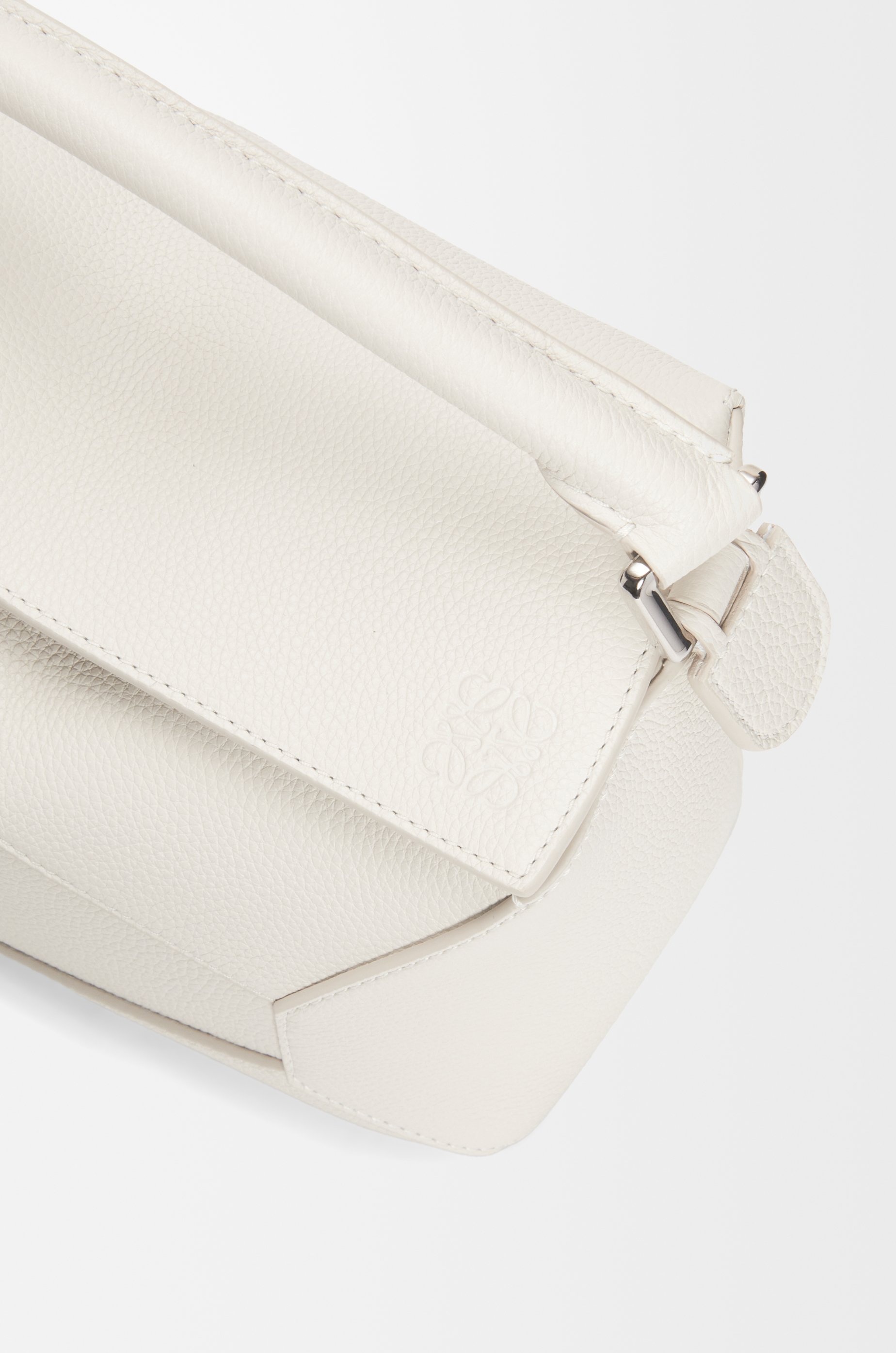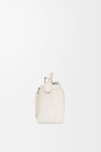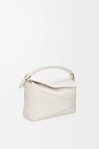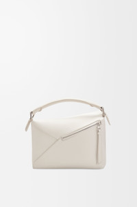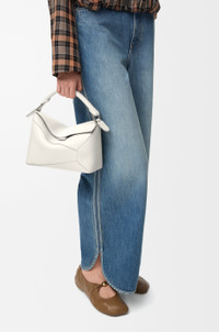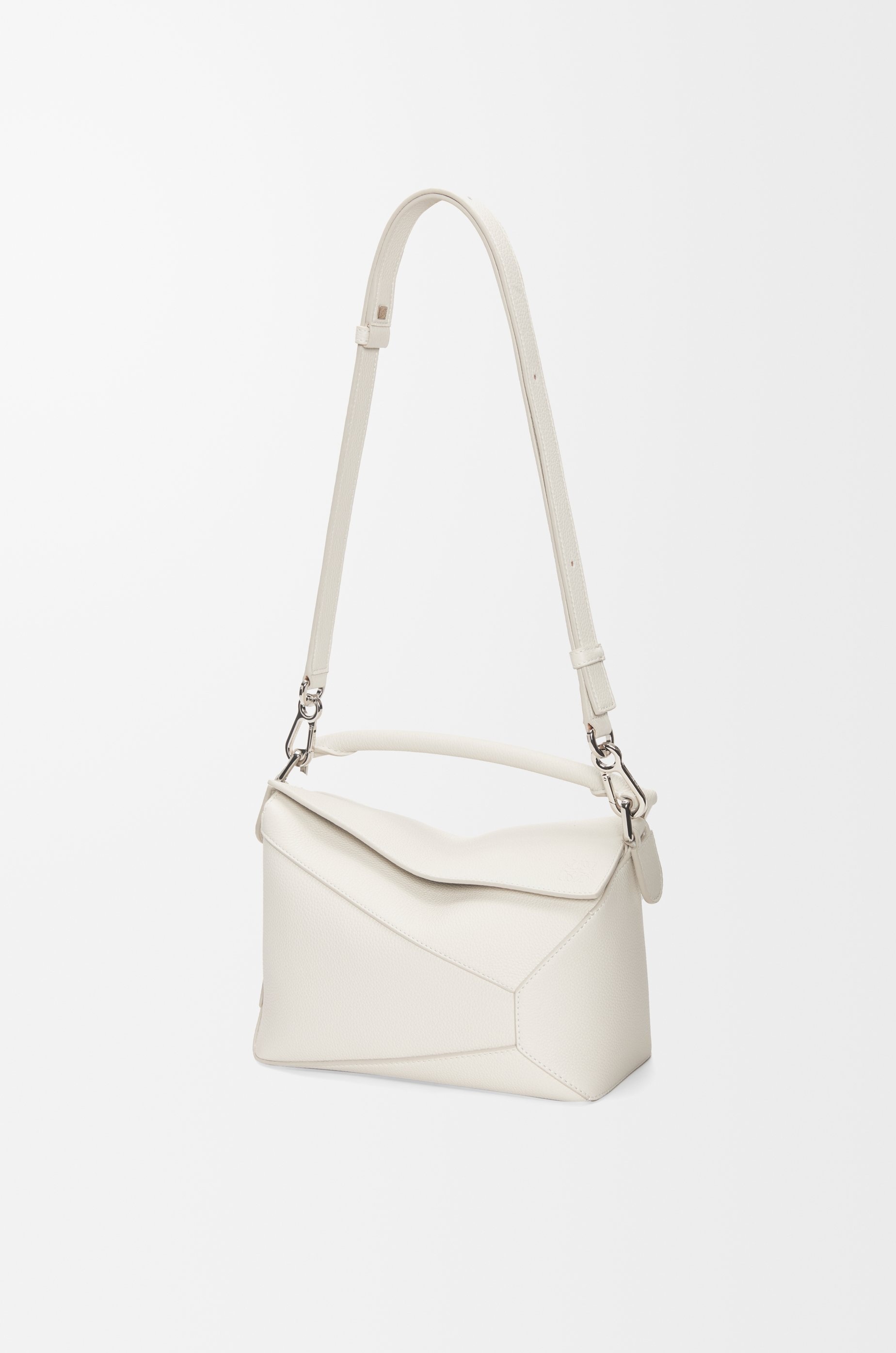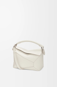 The Puzzle bag is the debut bag for LOEWE by Creative Director Jonathan Anderson. A cuboid shape and precise cutting technique create Puzzle’s distinctive geometric lines. This small version is crafted in soft grained calfskin. - The small Puzzle can hold a large wallet, all mobile phones and sunglasses case. - Shoulder, crossbody or hand carry - Detachable and adjustable strap - Top handle - Zip closure with calfskin puller - External zip rear pocket - One internal slip pocket - Herringbone cotton canvas lining - Embossed Anagram Details - Colour : Soft White - Metallic colour : Palladium - Main material : Soft Grained Calf - Strap length : 80.5 - 115.5 cm - Strap drop : 40 - 58 cm - Handle drop : 7 cm - Weight : 0.65 kg - Height (cm) : 16.5 - Width (cm) : 24 - Depth (cm) : 10.5 - Height (inch) : 6.5 - Width (inch) : 9.4 - Depth (inch) : 4.1 - Model ID : A510P60X30 - CIL : - 0010896744 - Made in : Spain