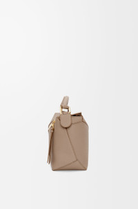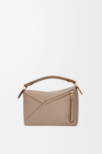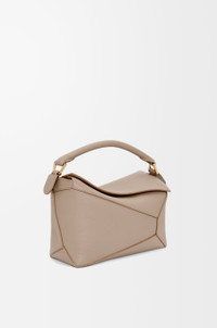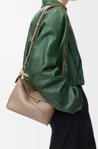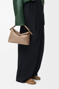 The Puzzle bag is the debut bag for LOEWE by Creative Director Jonathan Anderson. A cuboid shape and precise cutting technique create Puzzle’s distinctive geometric lines. This small version is crafted in soft grained calfskin with overlapped edges. - The small Puzzle can hold for example a large wallet, all mobile phones and sunglasses - Shoulder, crossbody, top handle or clutch carry - Removable and adjustable shoulder strap - Zip closure with calfskin pull - Exterior zip rear pocket and one internal slip pockets - Customisable with strap and personalisation charms - Herringbone cotton canvas lining - Embossed Anagram Details - Colour: Sand - Metallic colour: Gold - Main material: Soft Grained Calf - Strap length: 80.5 - 115.5 cm - Handle drop: 7 cm - Weight: 0.65 kg - Height (cm): 16.5 - Width (cm): 24 - Depth (cm): 10.5 - Height (inch): 6.5 - Width (inch): 9.4 - Depth (inch): 4.1 - Model ID: A510P60X30 - CIL: 0010896710 - Made in: Spain