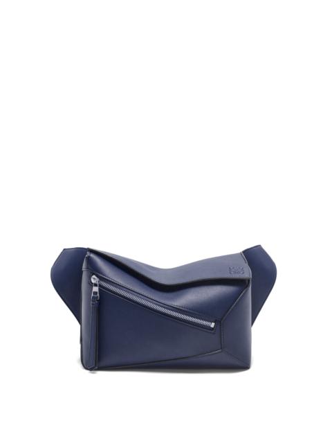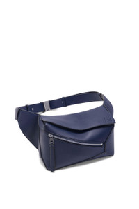 The Puzzle bag is the debut bag for LOEWE by Creative Director Jonathan Anderson. A cuboid shape and precise cutting technique create Puzzle’s distinctive geometric lines. This small bumbag version is crafted in classic calfskin with overlapped edges. - Shoulder or crossbody carry - Adjustable shoulder strap featuring metal clasp closure with engraved LOEWE - Zip closure with calfskin zip pull - External zip pocket and internal slip pocket - Herringbone cotton canvas lining - Embossed Anagram Details - Colour: Abyss Blue - Metallic colour: Palladium - Main material: Classic Calf - Strap length: 88 - 147 cm - Weight: 0.54 kg - Height (cm): 16 - Width (cm): 24 - Depth (cm): 10.5 - Height (inch): 6.3 - Width (inch): 9.4 - Depth (inch): 4.1 - Model ID: B510SEBX02 - CIL: 0011083359 - Made in: Spain