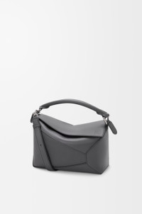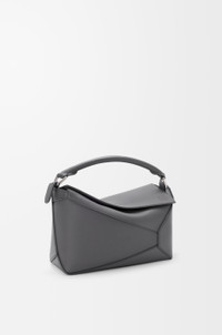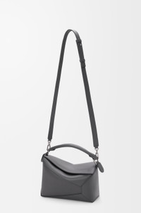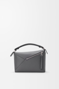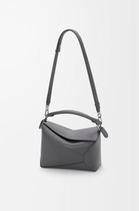 The Puzzle Edge is defined by its distinctive geometric lines and its cuboid form. It differs to the classic construction in its overlapped panels with single stitch lines. This small version is crafted in classic calfskin. - Shoulder, crossbody or hand carry - Detachable and adjustable strap - Zip closure with calfskin pull - One external zip rear pocket, one internal slip pocket - Herringbone cotton canvas lining - Embossed Anagram Colour: Slate Metallic colour: Palladium Main material: Classic Calf Strap length: 80.5-115.5 cm Strap drop: 40 - 58 cm Handle drop: 7 cm Weight: 0.52 kg Height: 16.5 cm Width: 24 cm Depth: 10.5 cm Made in: Spain