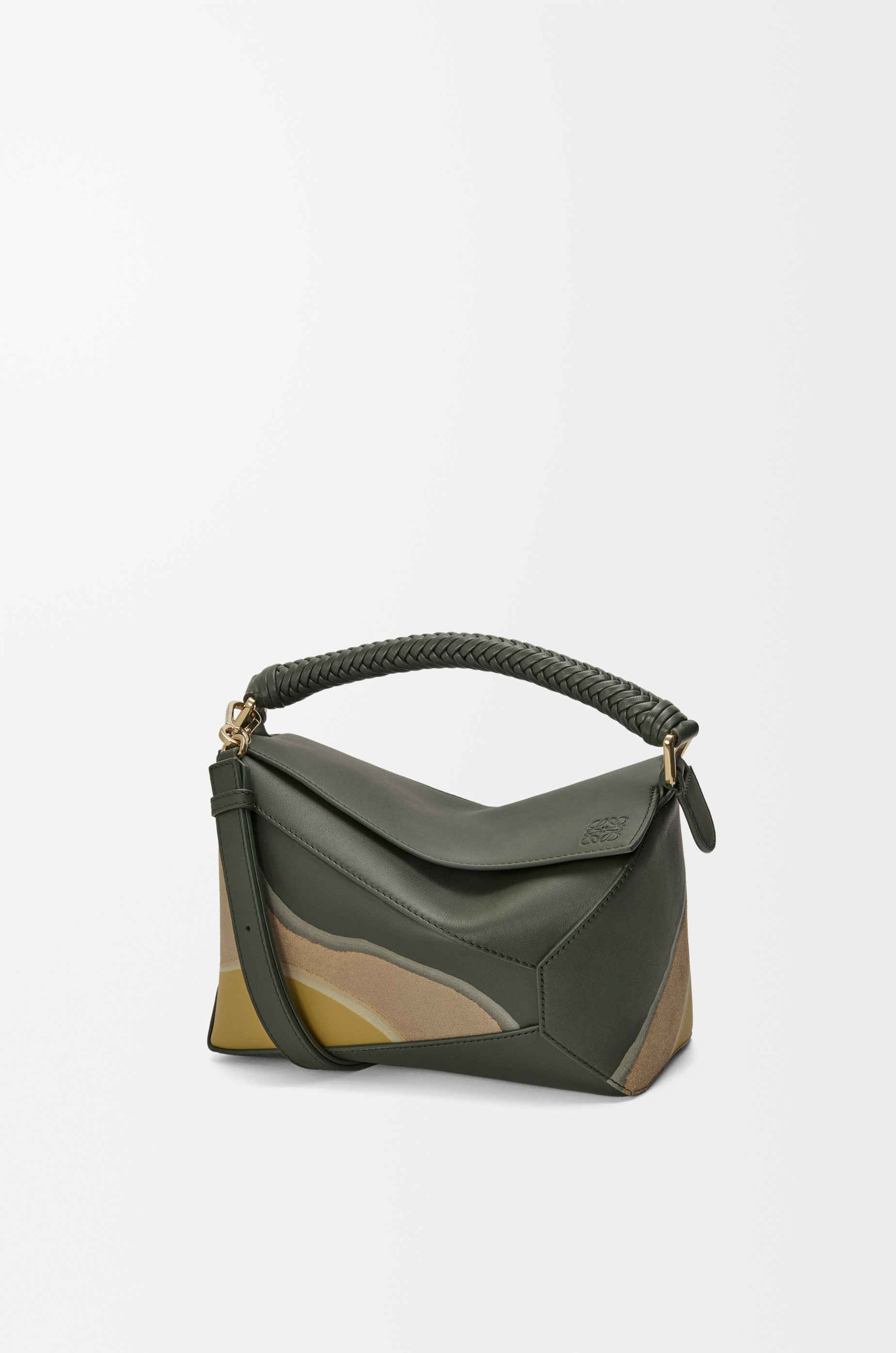 The Puzzle Edge Landscape is defined by its distinctive geometric lines and its cuboid form. It differs to the classic construction in its overlapped panels with single stitch lines. This small version is crafted in nappa calfskin and suede, layered, compressed and skived to create a one-of-a-kind effect, with a woven top handle. - Shoulder, crossbody or hand carry - Detachable and adjustable strap - Zip closure with calfskin pull - One external zip rear pocket, one internal slip pocket - Suede lining - Embossed Anagram Colour: Bottle Green/Ochre Metallic colour: Gold Main material: Nappa Calf Strap length: 80.5 - 115.5 cm Strap drop: 40 - 58 cm Handle drop: 7 cm Weight: 0.5785 kg Height: 16.5 cm Width: 24 cm Depth: 10.5 cm Made in: Spain