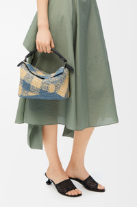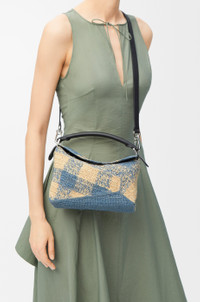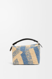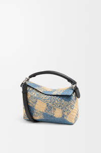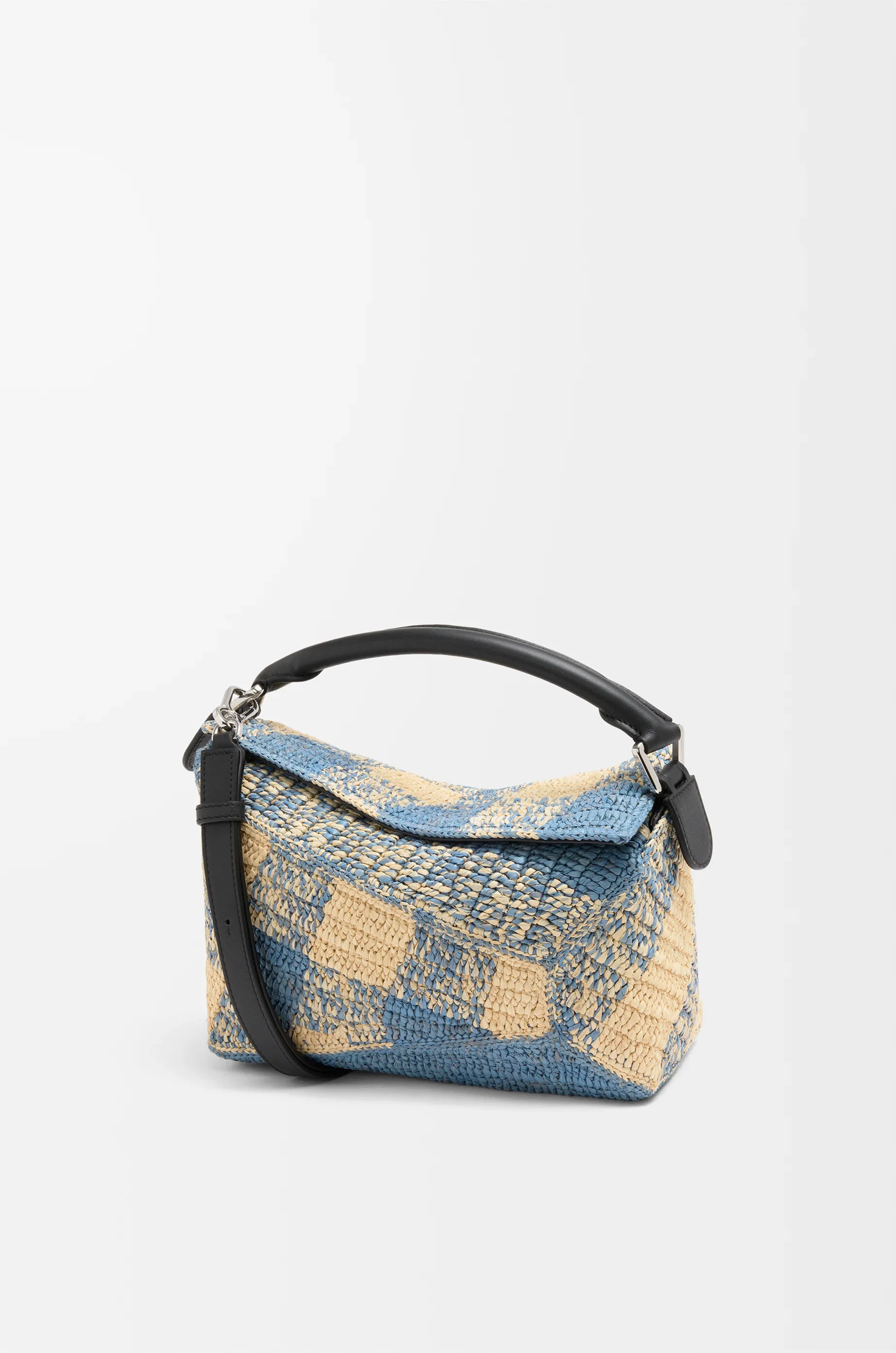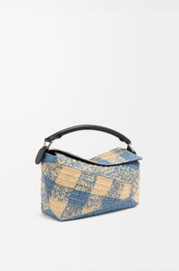 The Puzzle Edge is defined by its distinctive geometric lines and its cuboid form. It differs to the classic construction in its overlapped panels with single stitch lines. This small version is crafted in raffia and calfskin and features a gingham pattern. - Shoulder, crossbody or hand carry - Detachable and adjustable strap, top handle - Zip closure with calfskin pull - One internal slip pocket - Herringbone cotton canvas lining Colour: Natural/Light Blue Metallic colour: Palladium Main material: Raffia/Calf Strap length: 80.5 - 115.5 cm Strap drop: 40 - 58 cm Handle drop: 7 cm Weight: 0.56 kg Height: 16.5 cm Width: 24 cm Depth: 10.5 cm Made in: Spain